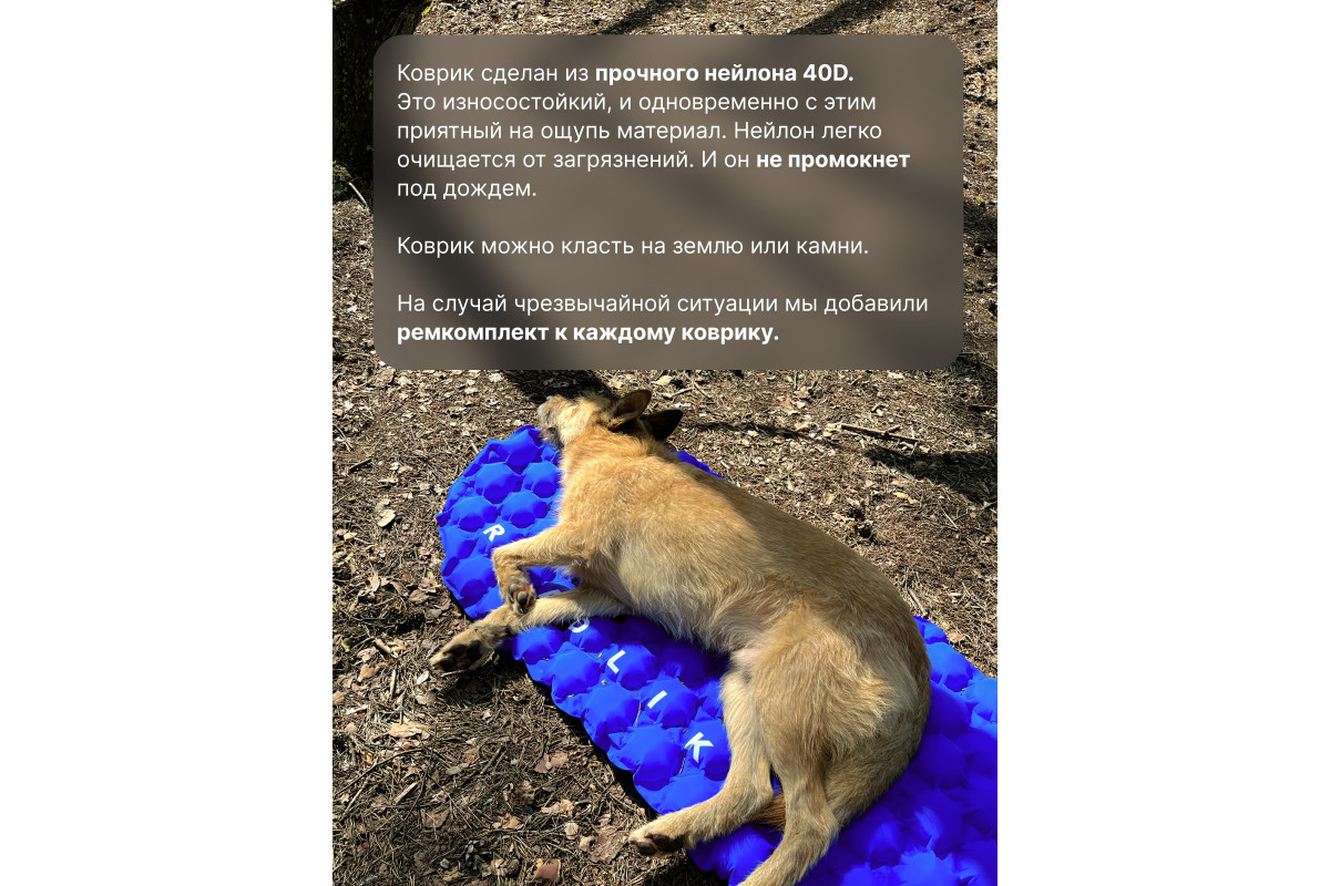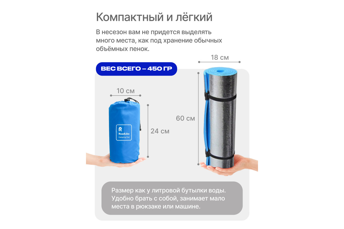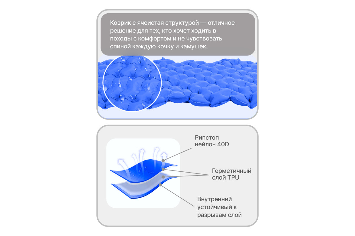Сверхлегкий туристический коврик от RoadLike Camping в компактном чехле. Выполнен из высокопрочного и износостойкого материал Нейлон 40, водонепроницаемый и отлично выдерживает суровые условия. Инновационные технологии позволили создать сверхлегкий и компактный коврик, который станет незаменимым спутником любого путешествия. Подходит для активного отдыха на открытом воздухе, кемпинга, прогулок, туризма, рыбалки, отдыха, альпинизма, путешествий, ночевок и многого другого. Вес: 500 гр Размер: 192х58 см. Размер в чехле: 28х5х5 см. Ячеистая структура сохраняет и равномерно распределяет тепло, а также обеспечивает оптимальную поддержку во время сна. Двойной клапан обеспечивает быстрое надувание - хватит всего 10-15 вдохов, насос не потребуется. RoadLike. Возьми комфорт в дорогу.