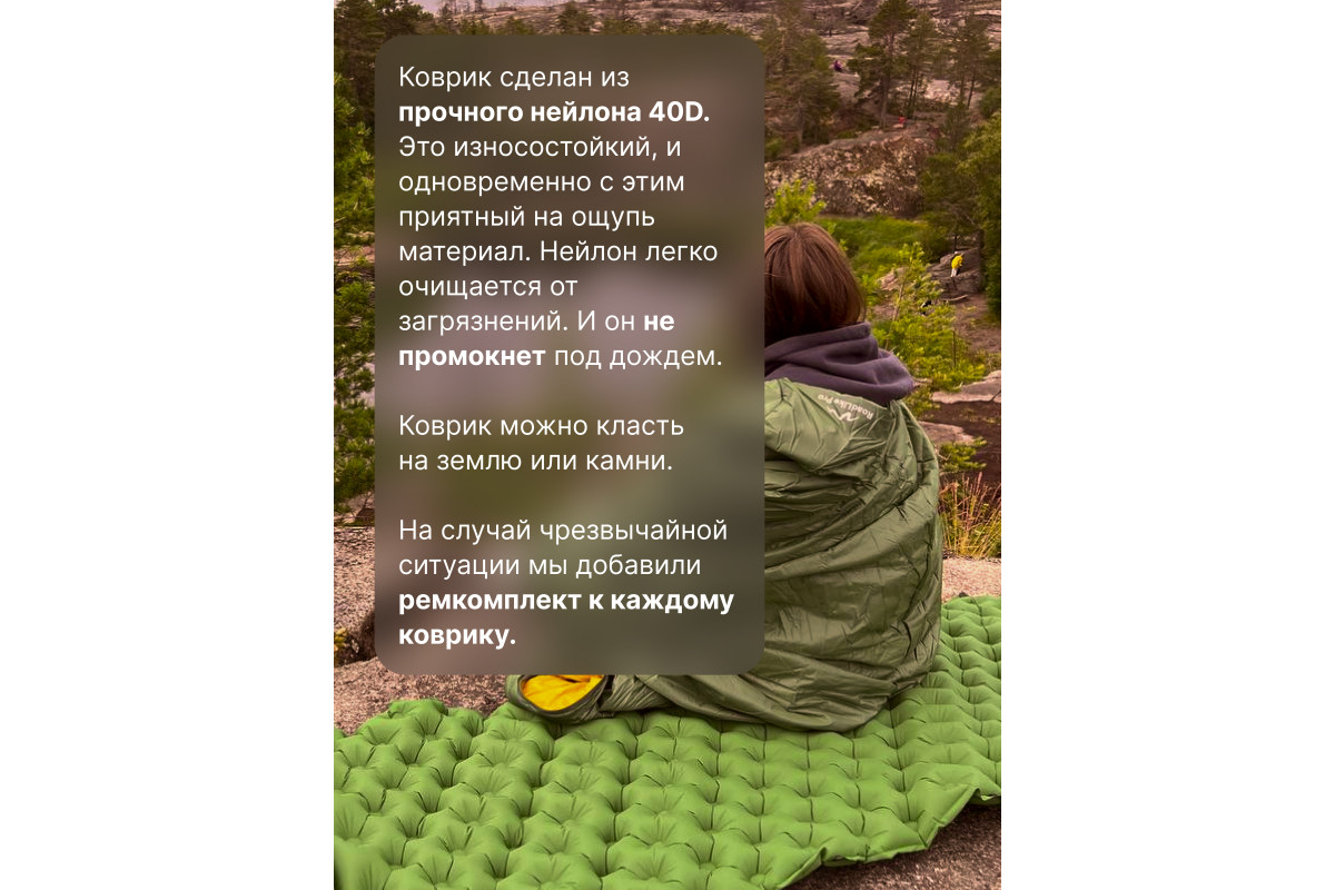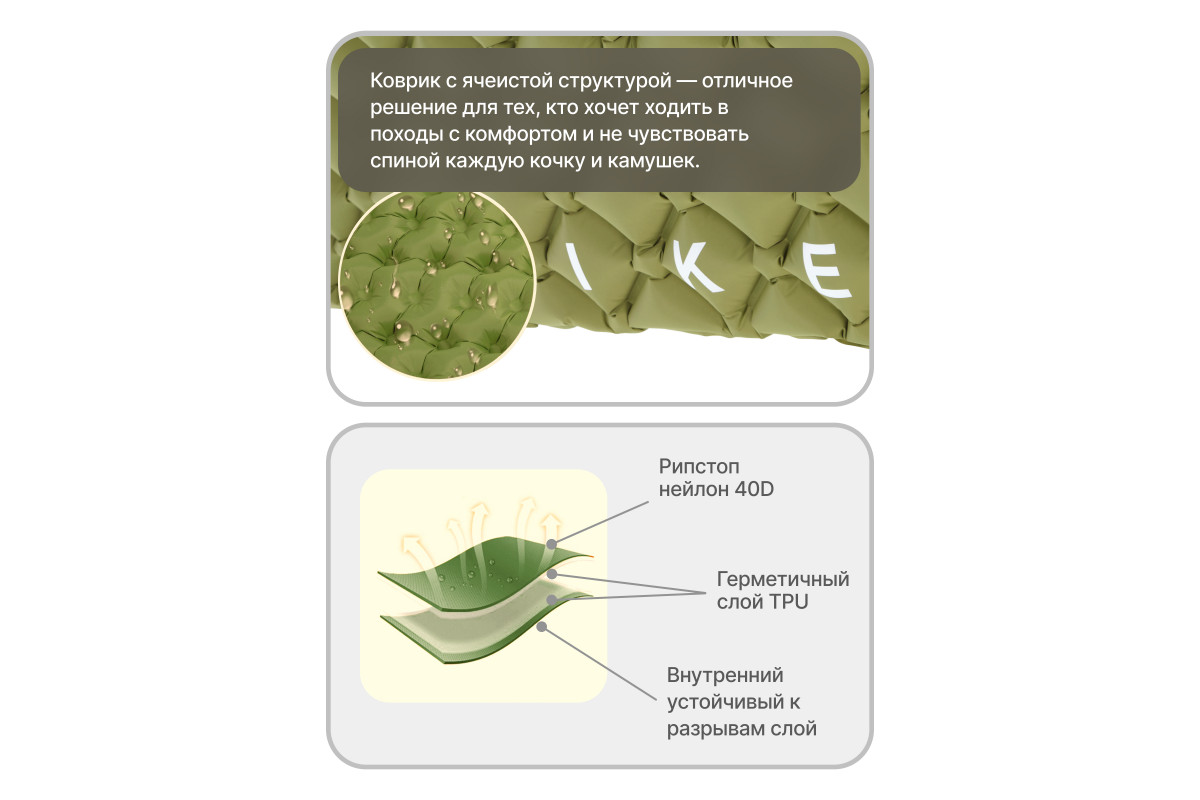 Сверхлегкий туристический коврик от RoadLike Camping в компактном чехле. Выполнен из высокопрочного и износостойкого материал Нейлон 40, водонепроницаемый и отлично выдерживает суровые условия. Инновационные технологии позволили создать сверхлегкий и компактный коврик, который станет незаменимым спутником любого путешествия. Подходит для активного отдыха на открытом воздухе, кемпинга, прогулок, туризма, рыбалки, отдыха, альпинизма, путешествий, ночевок и многого другого. Вес: 500 гр Размер: 192х58 см. Размер в чехле: 28х5х5 см. Ячеистая структура сохраняет и равномерно распределяет тепло, а также обеспечивает оптимальную поддержку во время сна. Двойной клапан обеспечивает быстрое надувание - хватит всего 10-15 вдохов, насос не потребуется. RoadLike. Возьми комфорт в дорогу.