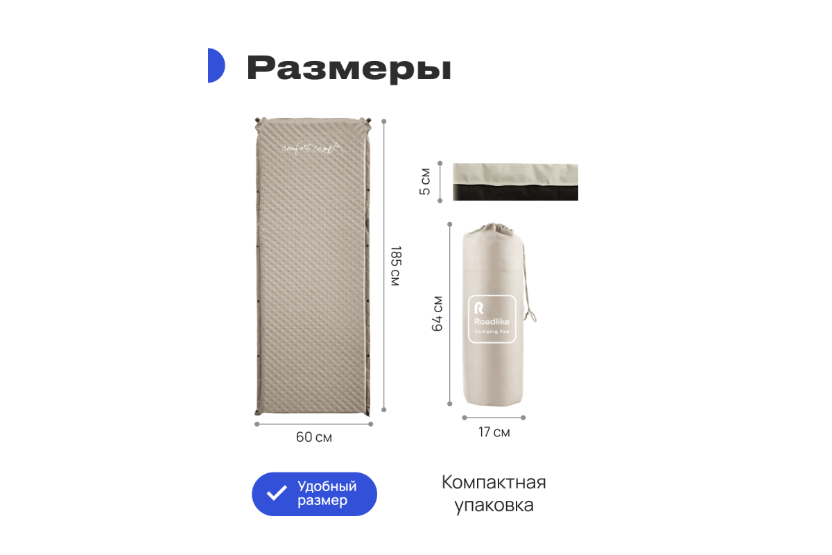 Коврик туристический самонадувающийся RoadLike Comfort Camp - в комфортном размере: 185*60*5см. Коврик RoadLike Comfort Camp обеспечивает максимальный комфорт и теплоизоляции во время многодневного кемпинга. Сверхмягкий, благодаря своей толщине является прекрасной альтернативой надувным кроватям, скроет любые неровности в виде камней или корней под полом палатки. Упругий наполнитель из вспененного материала сглаживает мелкие неровности поверхности и обеспечивает комфортный сон. Плотный материал верха и полностью проклеенные швы гарантируют долговечность. Сложенный коврик надувной туристический можно стянуть резинками и убрать в чехол. Вспененный полиуретан обеспечивает прекрасную теплоизоляцию и упругость характерную для ортопедических матрасов. RoadLike - возьми комфорт в дорогу!