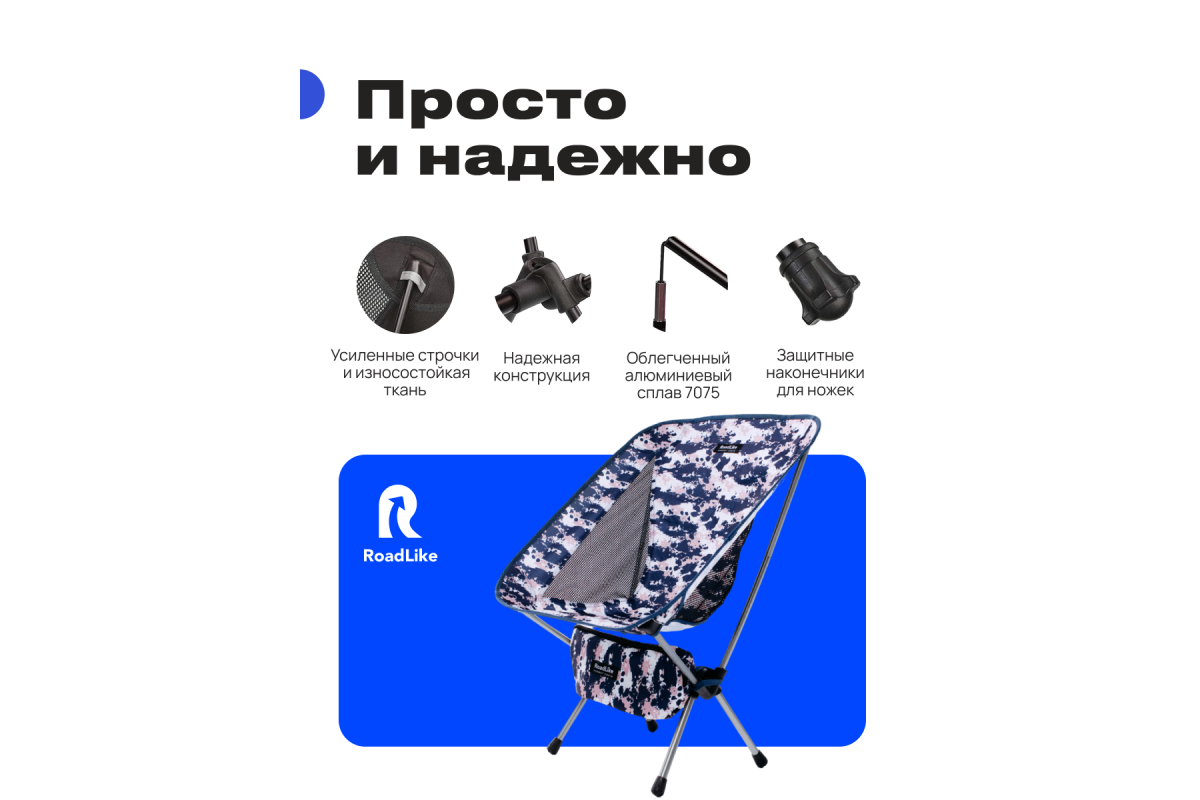 Если вы любите активный отдых на природе, то вам непременно понадобится стул туристический. Суперлегкое компактное кресло RoadLike – идеальный выбор для путешественников, которые ценят комфорт и удобство. Стул туристический RoadLike – это стул складной, который легко помещается в удобную сумку, включенную в комплект. Вы сможете взять его с собой в любое путешествие – на пикник, на рыбалку или на кемпинг. Компактный размер и легкий вес делают его идеальным для путешествий, а также для использования в качестве стула складного на террасе или в саду. Кресло выполнено из прочной и износостойкой ткани Оксфорд 600D и высокопрочной алюминиевой рамы, что обеспечивает надежность и долговечность конструкции. Конструкция кресла позволяет выдерживать вес до 110 кг, что делает его доступным для большинства людей. Эргономичный дизайн кресла подарит вам комфорт и удобство в использовании. Вы сможете расслабиться и насладиться окружающей природой, не испытывая дискомфорта. Кресло также может использоваться как стул для рыбалки, когда нужно сидеть на протяжении длительного времени. Благодаря удобной конструкции, вы сможете наслаждаться рыбалкой и отдыхом, не испытывая дискомфорта. Кресло садовое RoadLike – это не только туристический стул, но и идеальный выбор для релакса в саду или на террасе. Вы сможете наслаждаться свежим воздухом и красивым видом, расслабившись на удобном и комфортном кресле. В сложенном виде стул туристический RoadLike имеет размеры 36х12х12 см, что позволяет легко поместить его в рюкзак или багажник автомобиля. Он легкий и компактный, но при этом очень прочный и надежный. Если вы ищете стул туристический, который бы сочетал в себе удобство, компактность и прочность, то RoadLike – идеальный выбор для вас. Не упускайте возможность приобрести сверхлегкое компактное кресло RoadLike и наслаждаться комфортом и удобством в любых условиях. Покупайте уже сейчас и получите максимальный комфорт и удобство!