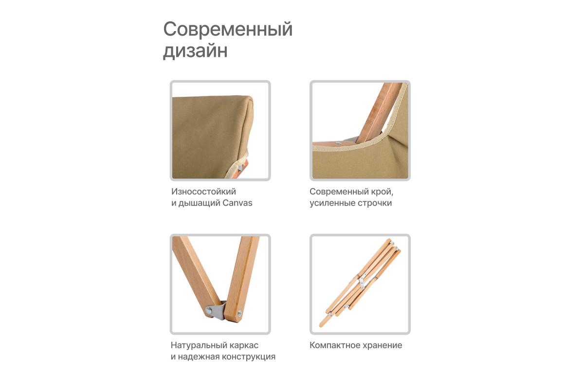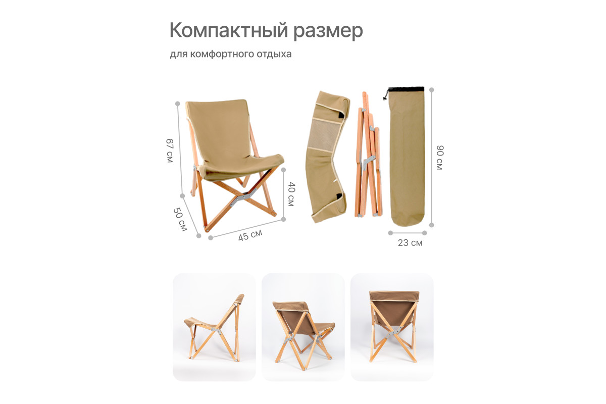Кресло туристическое RoadLike Wood Бежевый - размер 67*50*45 см. Складное кресло выполнено из натуральных метриалов: карксас из Бука, чехол из ткани Canvas - износостойкого и моющегося. Прочный и гладкий высококачественный каркас из цельного дерева обеспечивает стабильность и долговечность этого стула для кемпинга. Вся металлическая фурнитура устойчива к ржавчине и долговечна, а соединения надежны. Кресло удобное по форме и стильное по дизайну, обладает отличной грузоподъемностью до 120кг. Складное кресло RoadLike Wood для кемпинга можно хранить в машине в удобном чехле размером 90*23*23см. RoadLike Wood - серия туристической мебели для красивого отдыха!