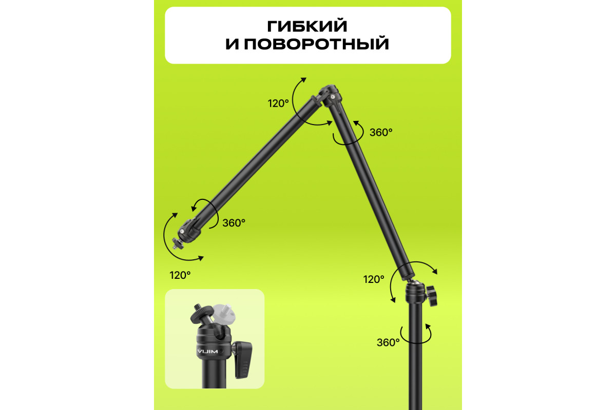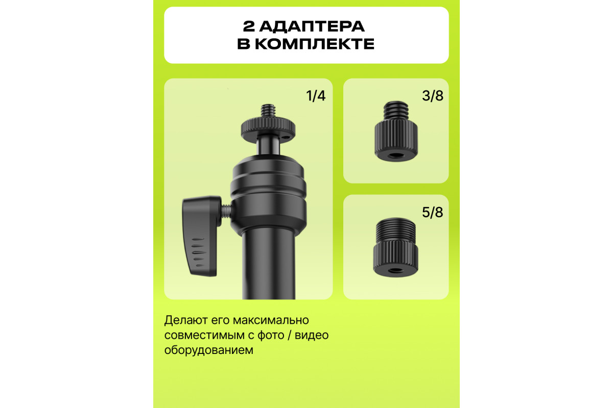 Универсальные крепления ¼ ,⅜, ⅝ и возможность удержать вес до 1 кг делают его совместимым с большинством камер, осветителями, микрофонами, стедикамами и другим оборудованием в студии и дома.