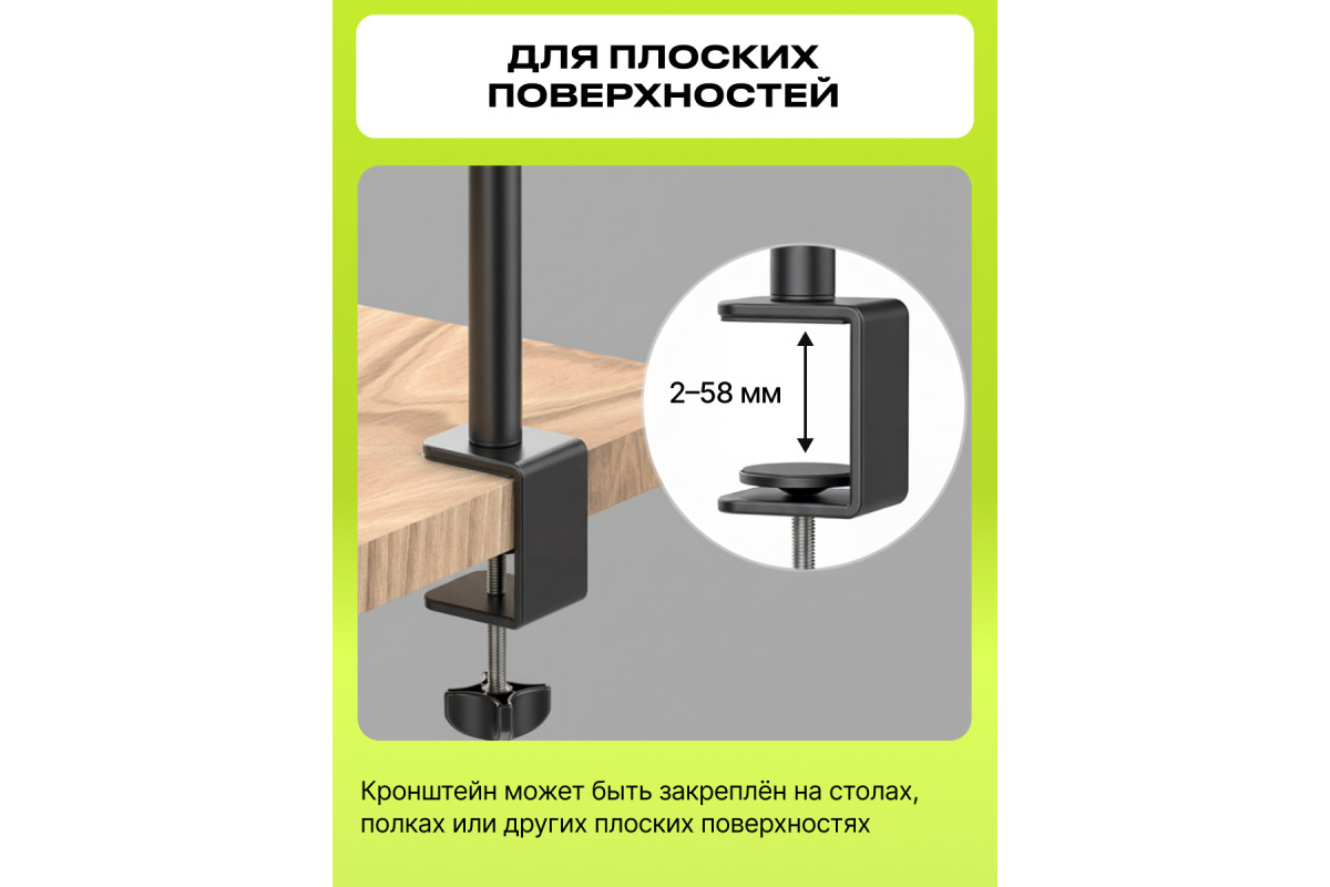 Raylab RL-GT3 - трехрычажный кронштейн, позволяющий установить фото и видео оборудование на стол, полку или другую плоскую поверхность, шириной от 3 до 58 мм.