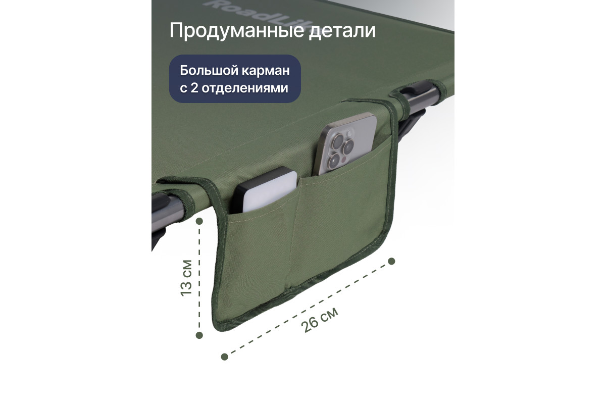 Раскладушка туристическая очень удобна и профессиональна. Она оснащена карманом для самых важных мелочей, таких как ключи, документы, телефон и прочее. Компактный размер в сложенном виде (50х20х20 см) и удобный чехол для хранения позволяют легко и быстро упаковать раскладушку туристическую и выдвинуться в путь. Раскладушка складная – это идеальный вариант для тех, кто ценит комфорт и удобство в походах и путешествиях.