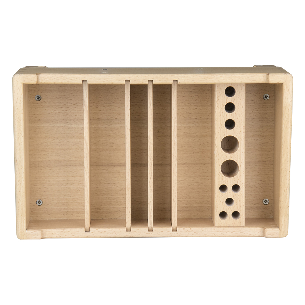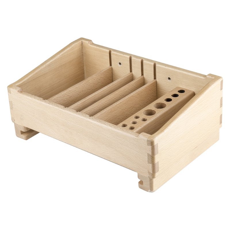 Он оснащен четырьмя съемными и взаимозаменяемыми разделителями. Держатель для ручек находится в фиксированном положении и имеет отверстия различного диаметра.
