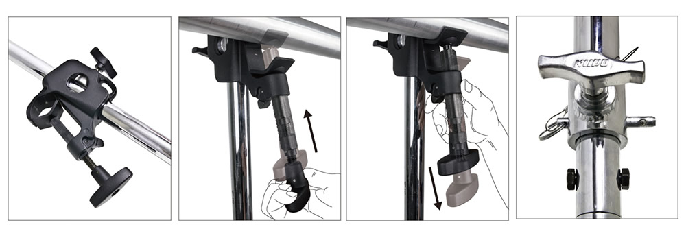 Быстродействующий зажим позволяет быстро и надёжно подвесить осветительное оборудование на уровне выше головы в тех местах, где затруднена установка на полу. (Запатентованная система)