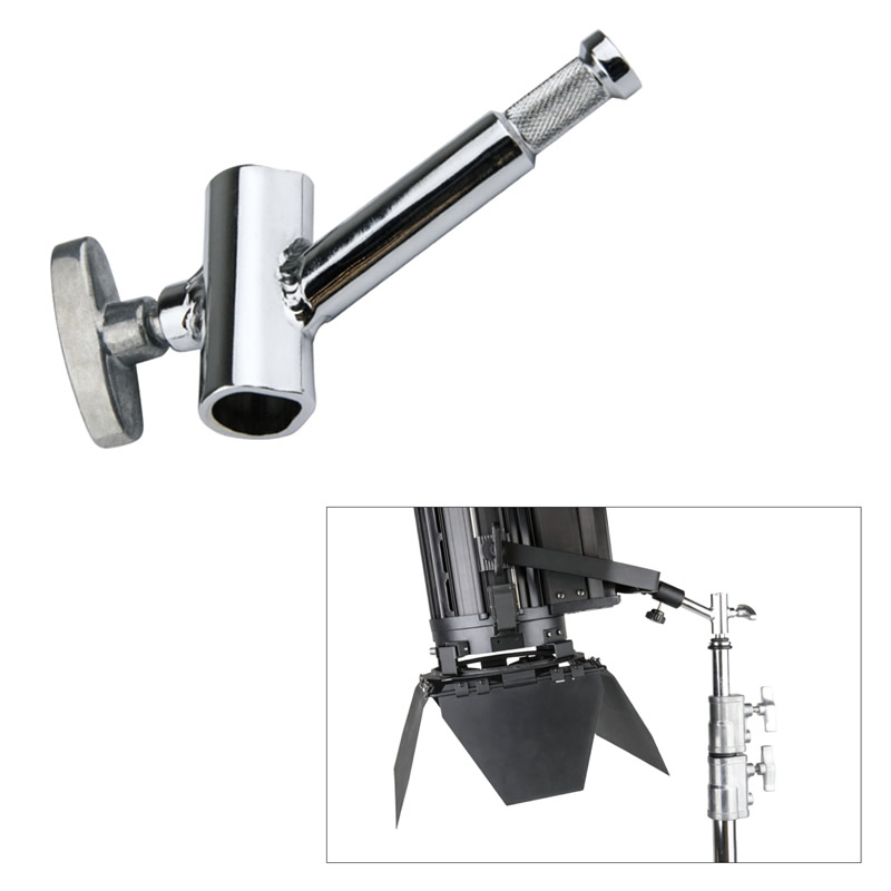 Втулка 5/8’’ baby receiver приварена к стержню baby pin длиной 3’’ под углом. Такая конструкция препятсвует возникновению помех, вызываемых шторками при установке на осветительный прибор или позволяет без труда устанавливать портретную тарелку под углом.
