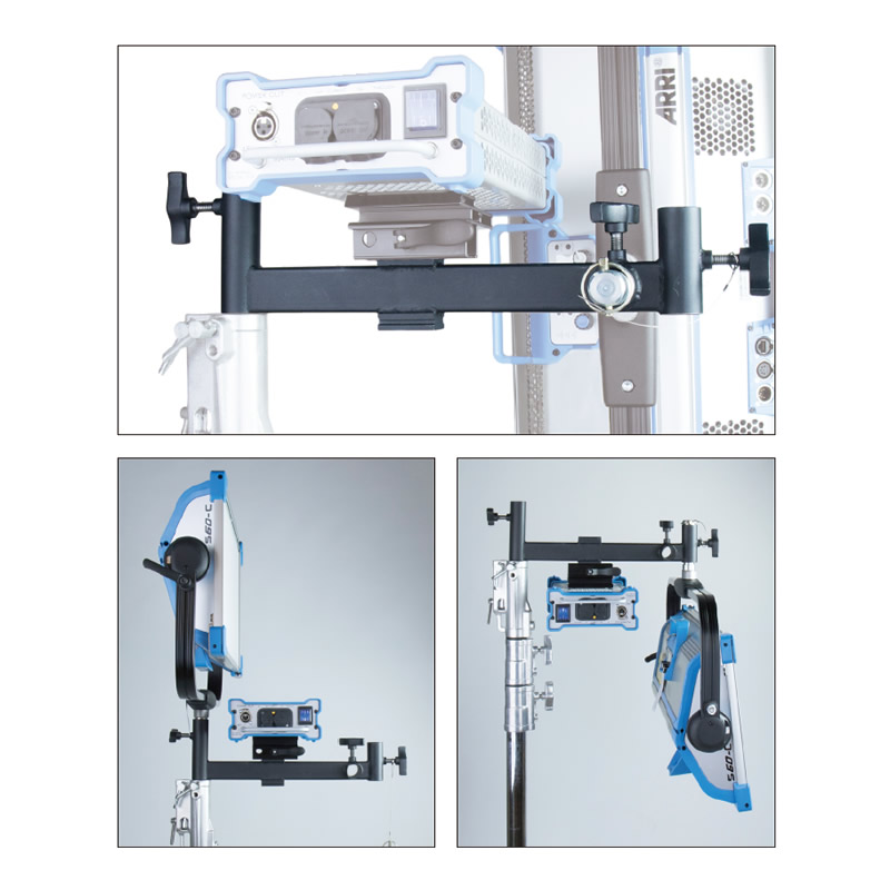 Прочный стальной кронштейн для бокового крепления осветительных панелей оснащен двойными крепёжными втулками 9/8"(28 мм), позволяющими устанавливать прибор в вертикальном или горизонтальном положении.