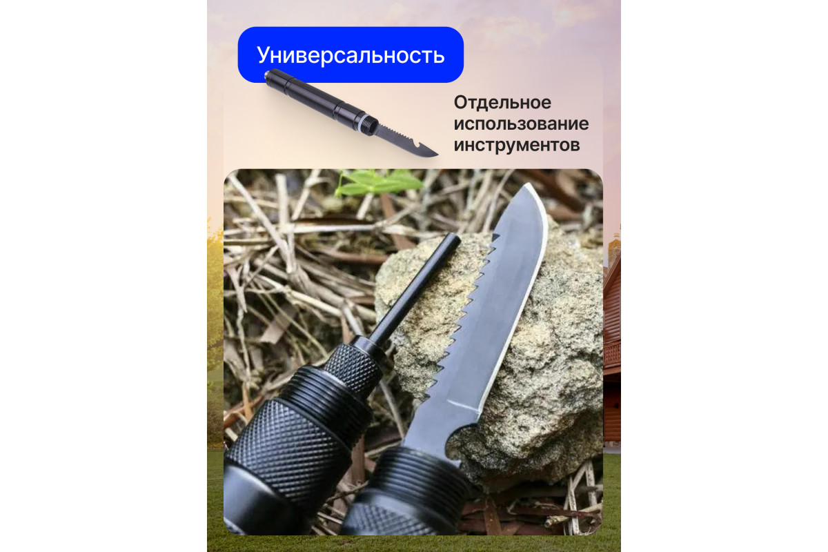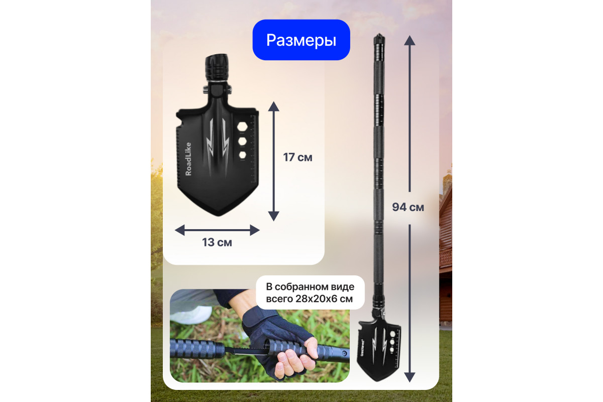Лопата туристическая многофункциональная RoadLike RLM01 - это универсальный инструмент, который станет вашим незаменимым помощником в походе, в условиях дикой природы, в лесу, в путешествии, на рыбалке, охоте, а также пригодится для дачи и сада, автомобиля. Эта складная лопата сочетает в себе топор, лопату, гаечные ключи, пилу, ледокол, стропорез, стеклобой, ножик (3 в 1 – открывалка, нож, пила), отвертку, розжиг. Благодаря своей многофункциональности, этот инструмент поможет вам решить множество задач, связанных с выживанием в экстремальных условиях. Лопата RoadLike RLM01 имеет нескользящую складную рукоять, которая обеспечивает удобное использование и хранение. Ее угол наклона тактической лопаты может быть регулирован, чтобы обеспечить оптимальную работу в различных условиях. Эта лопата также может использоваться как садовый инвентарь для дачи и огорода, для автомобиля (снегоуборочная, снеговая) или часть спортивного снаряжения. Лопата туристическая RLM01 имеет стильный дизайн и может быть хорошим подарком для мужа, папы, дяди, брата, дедушки, охотника, туриста, рыбака, любителя альпинизма, пикника и походов, туризма, кемпинга, спорта, охоты и рыбалки. Эта лопата также может использоваться как саперная лопата. Благодаря своей многофункциональности, она может использоваться для решения множества задач, связанных с выживанием в экстремальных условиях. Ее топор и лопата могут быть использованы для выкапывания окопов и рытвин, а ее другие инструменты могут помочь вам создать укрытие, разведать территорию и выполнить множество других задач. RoadLike RLM01 - это лопата, которая станет вашим надежным помощником в любых условиях. Она является идеальным выбором для тех, кто ищет универсальный инструмент, который всегда будет под рукой. RoadLike - нам по пути!