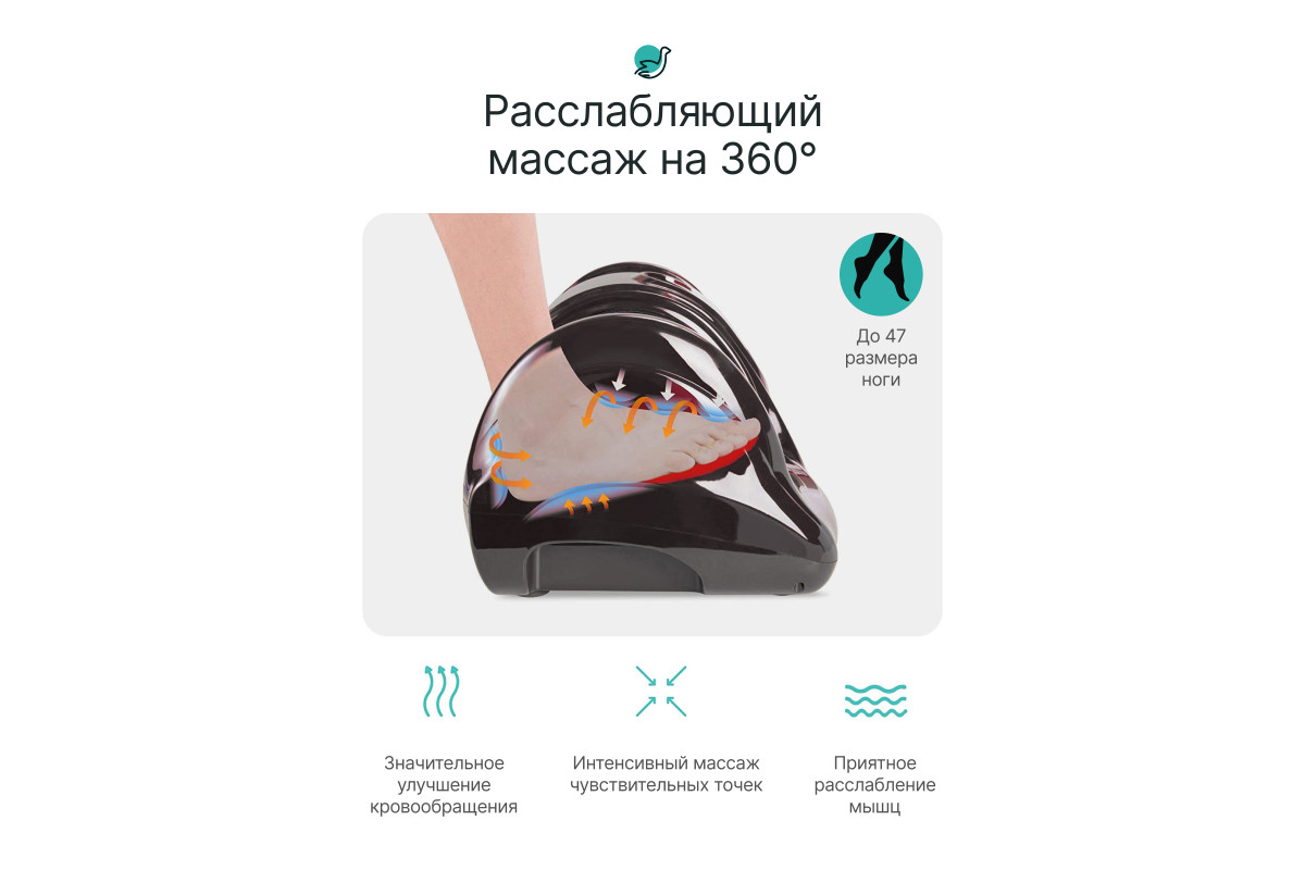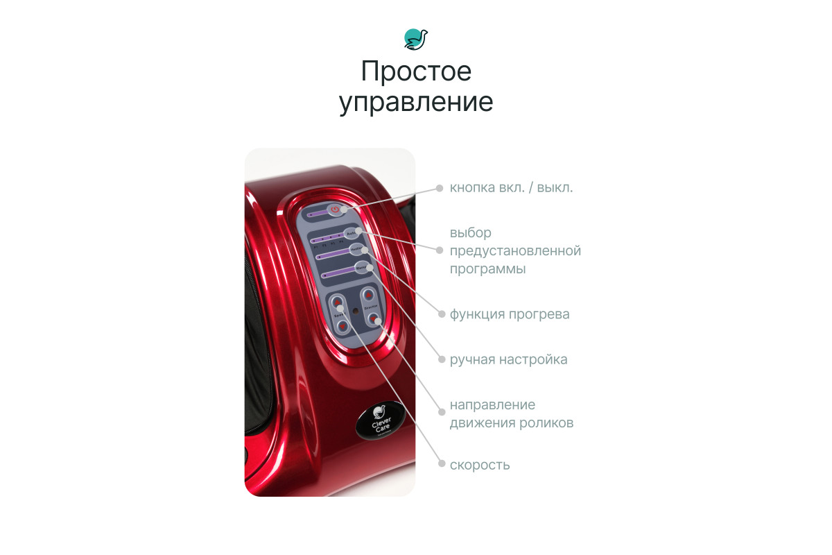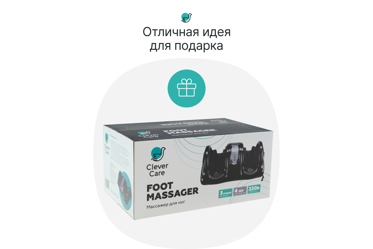 Массажер CleverCare Foot relax&heating прост в применении, имеет 4 встроенные программы, а также ручное управление для выбора оптимальной скорости, направления воздействия и функцию подогрева. Для удобства пользователя в комплекте есть пульт дистанционного управления, подробная инструкция с описанием теории и практики рефлексотерапии. Регулярное использование массажера CleverCare принесет вам расслабление, улучшит общий тонус организма, избавит от болей и хронических заболеваний. Перед использованием необходимо внимательно изучить инструкцию! CleverCare–feel your beauty!
