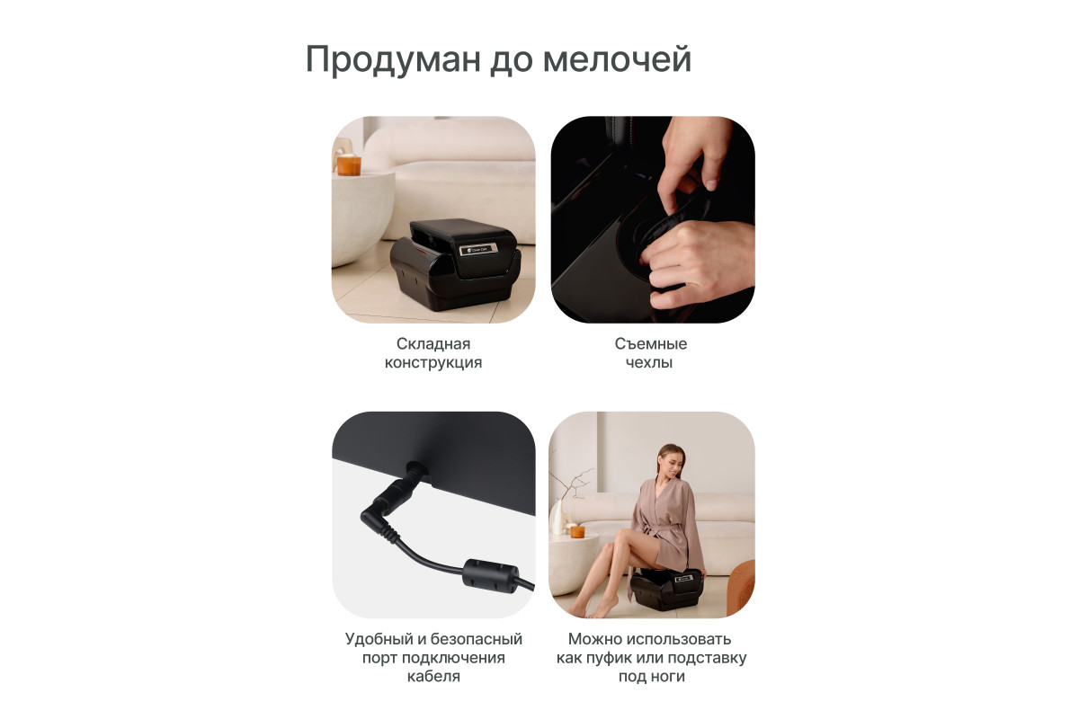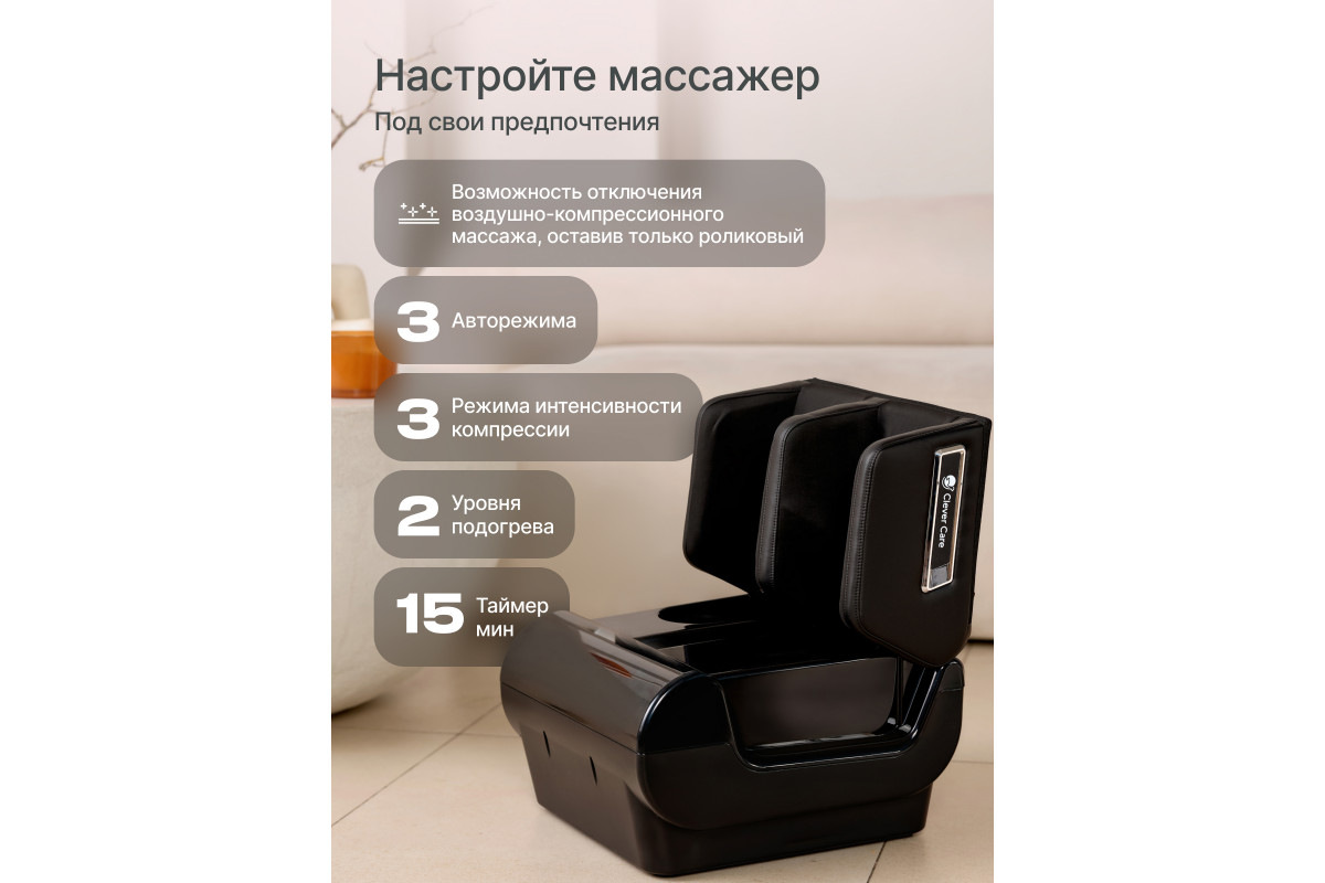 У массажера имеется 3 предустановленных режима, 2 уровня подогрева, 3 режима интенсивности компрессии икр (выбор уровня интенсивности работает только при включенном режиме компрессии), также есть автоматическое отключение массажера через 15 минут.