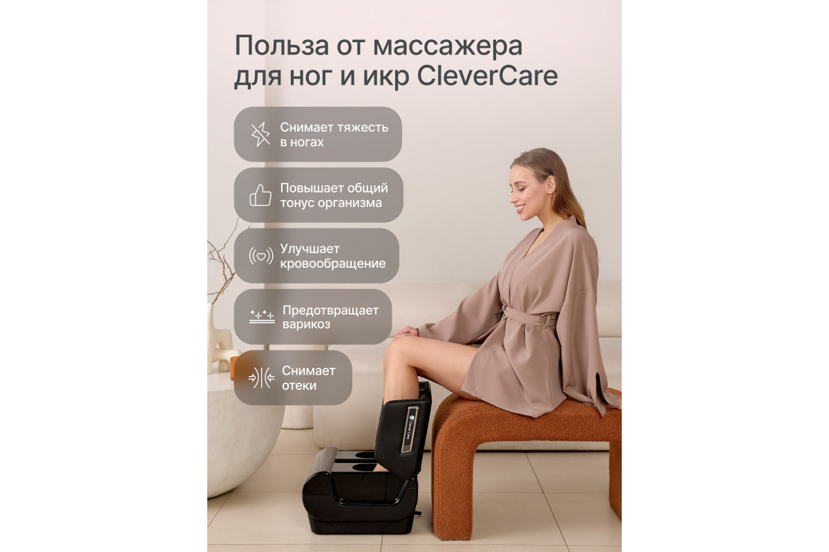 Интерьерный массажер для ног CleverCare Massage Capsula нового поколения, созданный в соответствии с основными принципами сдержанного и практичного оформления, осуществляет высококлассный роликовый массаж с компрессионным эффектом. Массажер подходит для поддержания здоровья всех ключевых структур нижних конечностей: ахиллова сухожилия, подошвенных фасций, связок, икроножных мышц и мышц стопы.