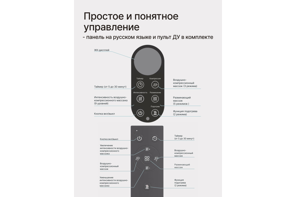 ИК прогревание; Выбор интенсивности массажа; Установка таймера от 50 до 30 минут; 3 режима компрессионного массажа.