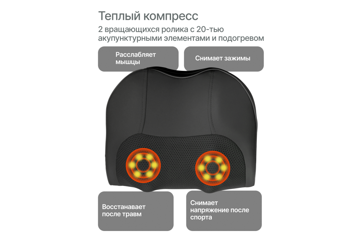 Интеллектуальный таймер отключения и энергосберегающий режим делают использование массажера для шеи и спины безопасным и удобным. Продуманная конструкция позволяет прорабатывать спину, шею, плечи, бёдра, руки и ягодицы. Регулярный массаж помогает облегчить боли в спине и шее, снять усталость в ногах и руках, оказывает антицеллюлитное действие и способствует восстановлению после физических нагрузок.