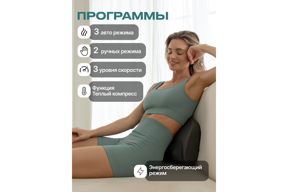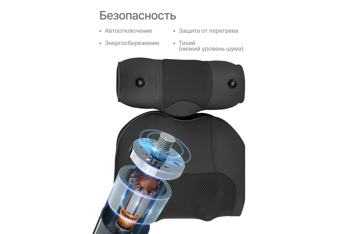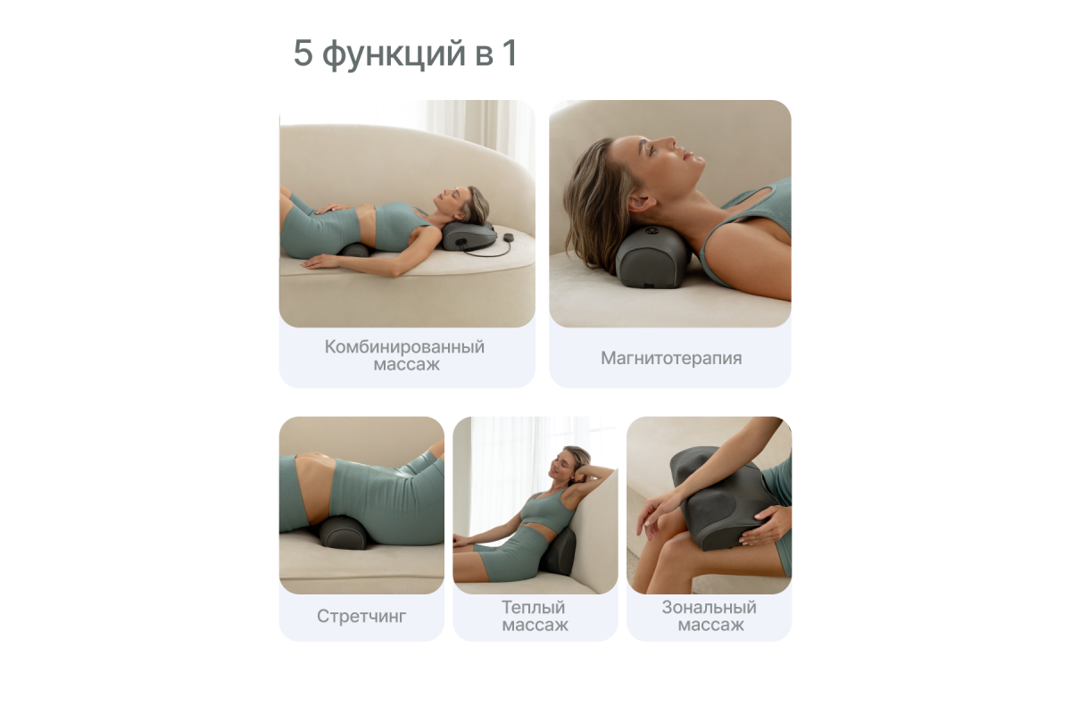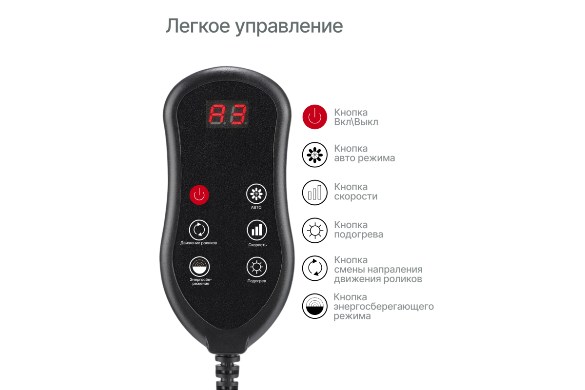 Устройство поддерживает три автоматических и два ручных режима с регулировкой трёх скоростей. Инфракрасный подогрев усиливает расслабляющий эффект, а встроенная магнитотерапия способствует восстановлению тканей и улучшает общее самочувствие.
