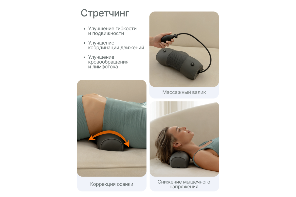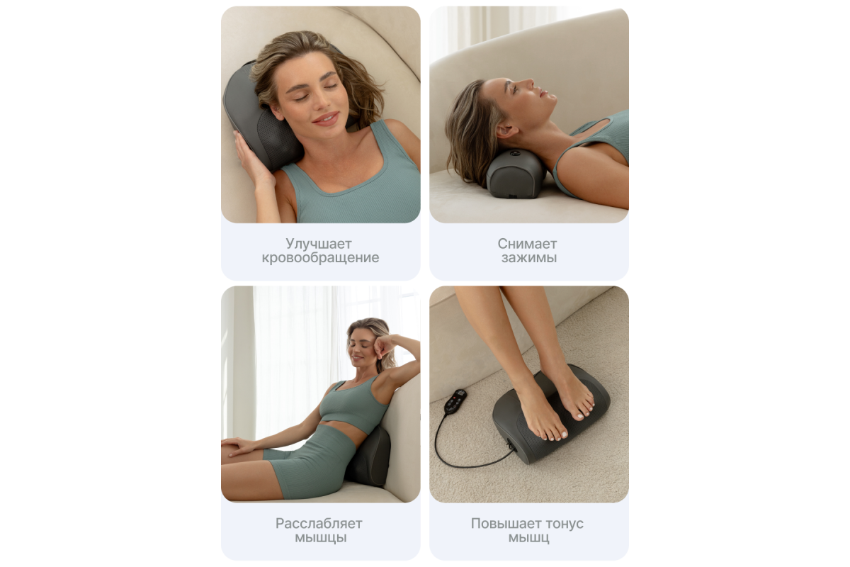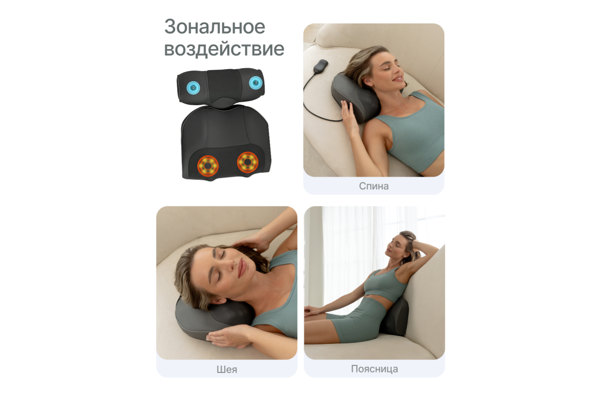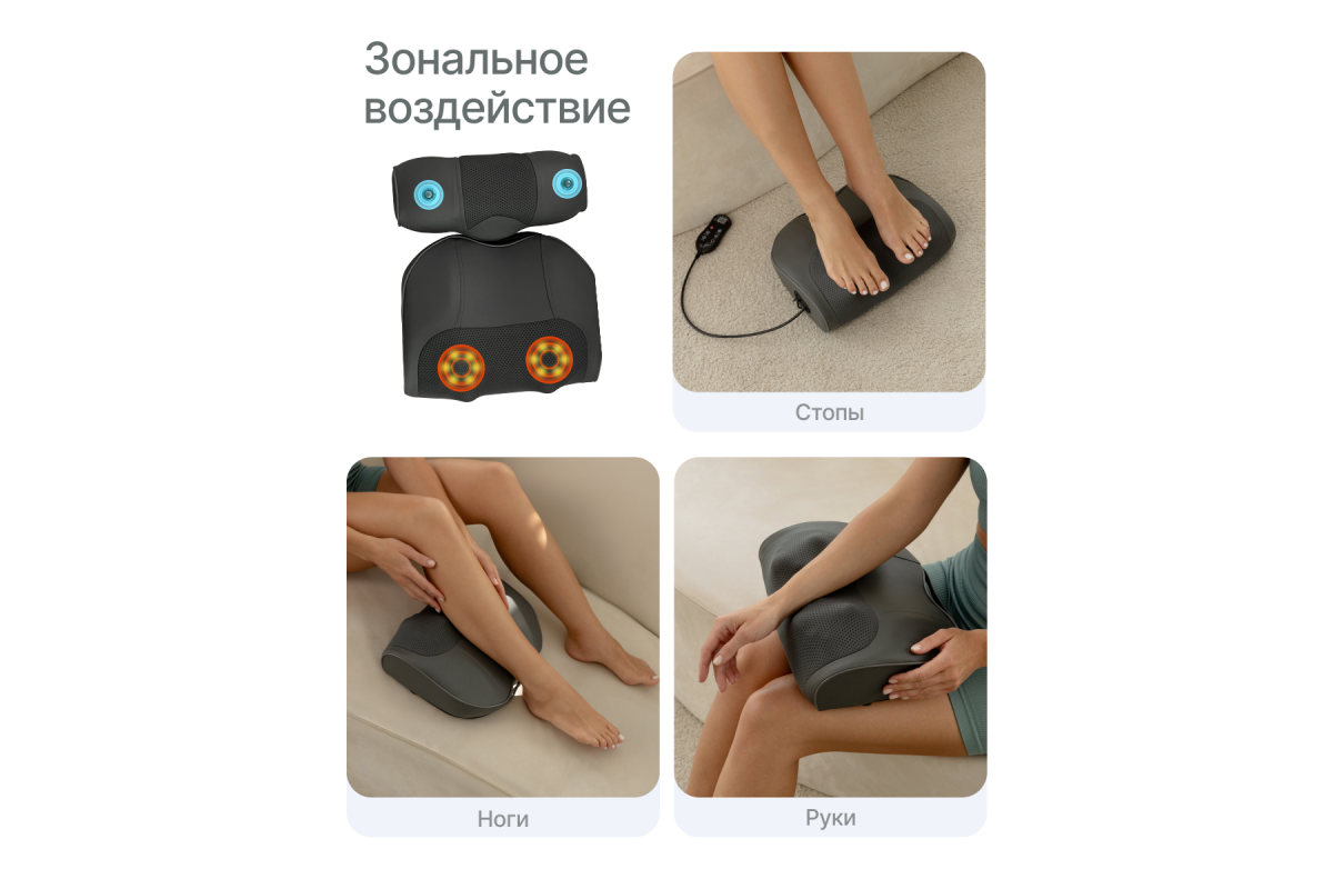 Устройство поддерживает три автоматических и два ручных режима с регулировкой трёх скоростей. Инфракрасный подогрев усиливает расслабляющий эффект, а встроенная магнитотерапия способствует восстановлению тканей и улучшает общее самочувствие.