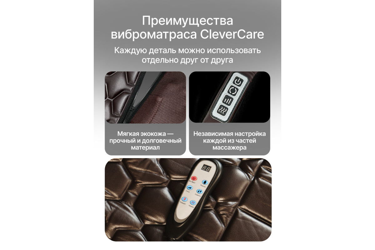 Матрас массажный с массажером ног CleverCare Full Body - идеальное решение для массажа дома. Максимальный комфорт от массажа создается в положении лежа, когда мышцы абсолютно расслаблены и находятся в состоянии покоя.