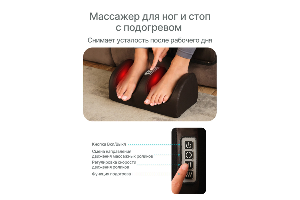 Массажер для ног избавляет от боли и неприятных ощущений в ногах и стопах. Массажёр можно настроить под свои потребности: выбрать подходящую скорость движения роликов, включить прогрев и определиться с направлением движения роликов - ваш идеальный массаж готов!