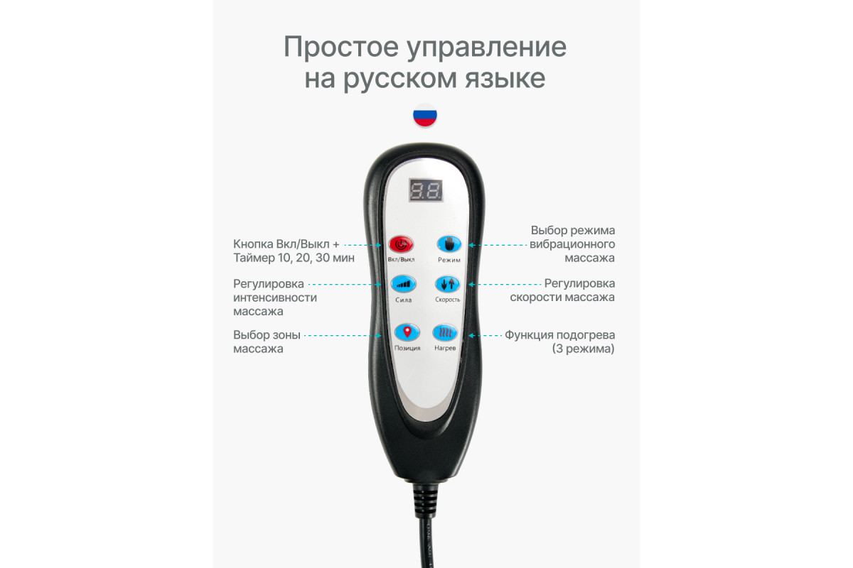 Пульт управления является удобным и интуитивно понятным средством управления всеми функциями матраса. Вы сможете легко выбрать и менять режимы массажа, интенсивность, время работы и другие параметры с помощью простых кнопок на пульте.