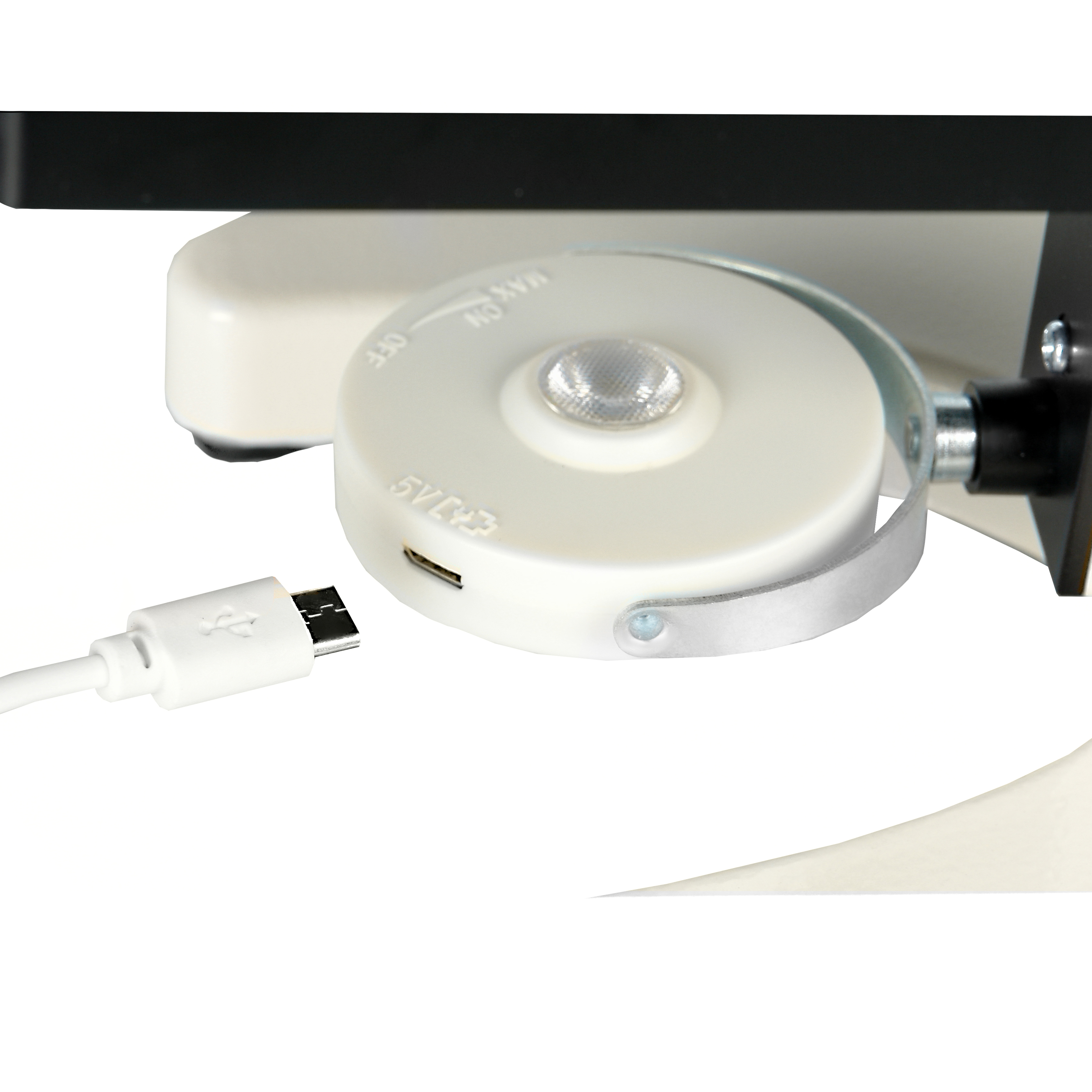 Светодиодный осветитель расположен с обратной стороны зеркала и точно так же может поворачиваться в двух плоскостях. Светодиод снабжен оптическим коллектором и регулятором яркости. Питается светодиод от встроенного в корпус осветителя аккумулятора, для его зарядки используется входящий в комплект кабель USB, подключаемый к стандартному сетевому зарядному устройству 5В / 1А. Зарядное устройство в комплект не входит и приобретается отдельно.