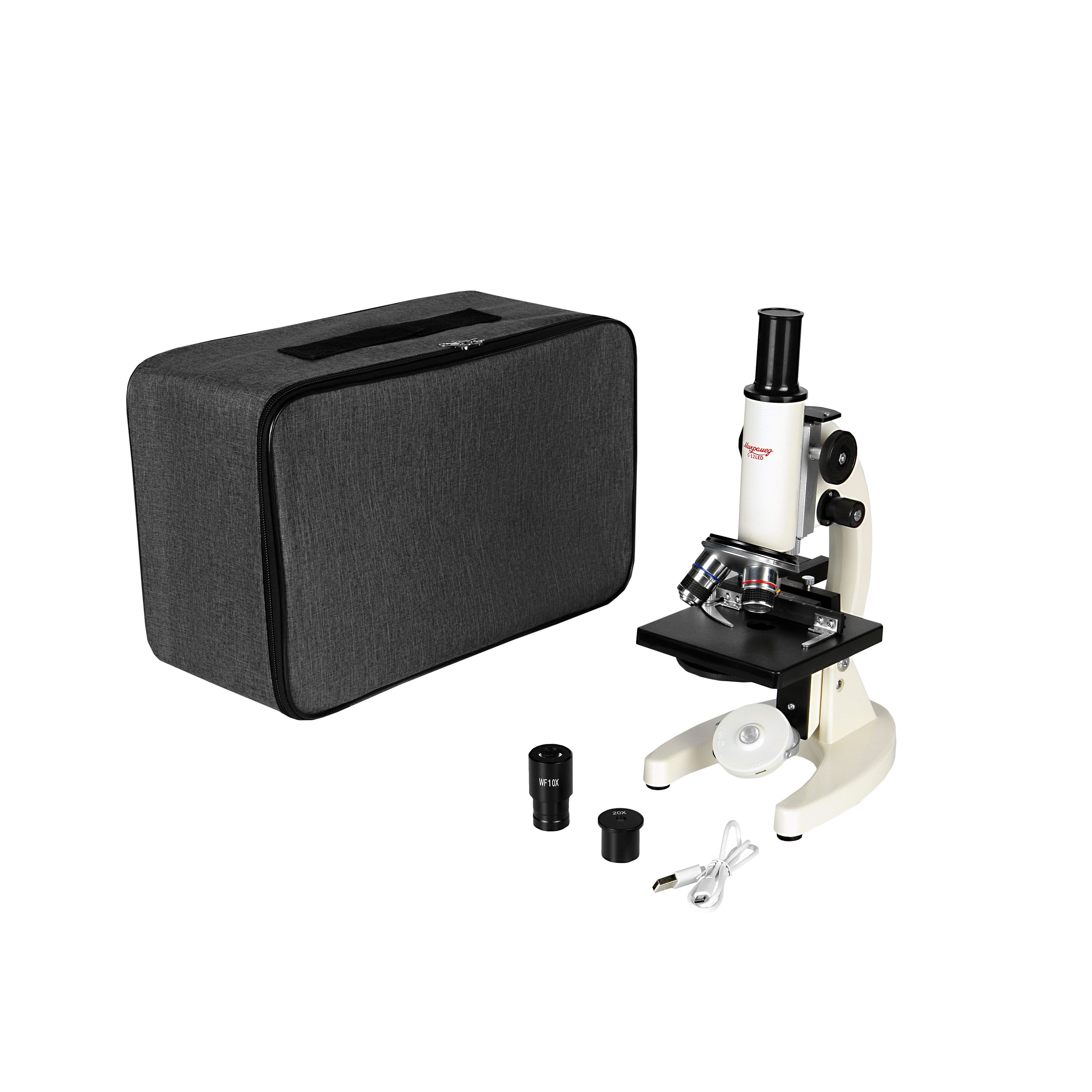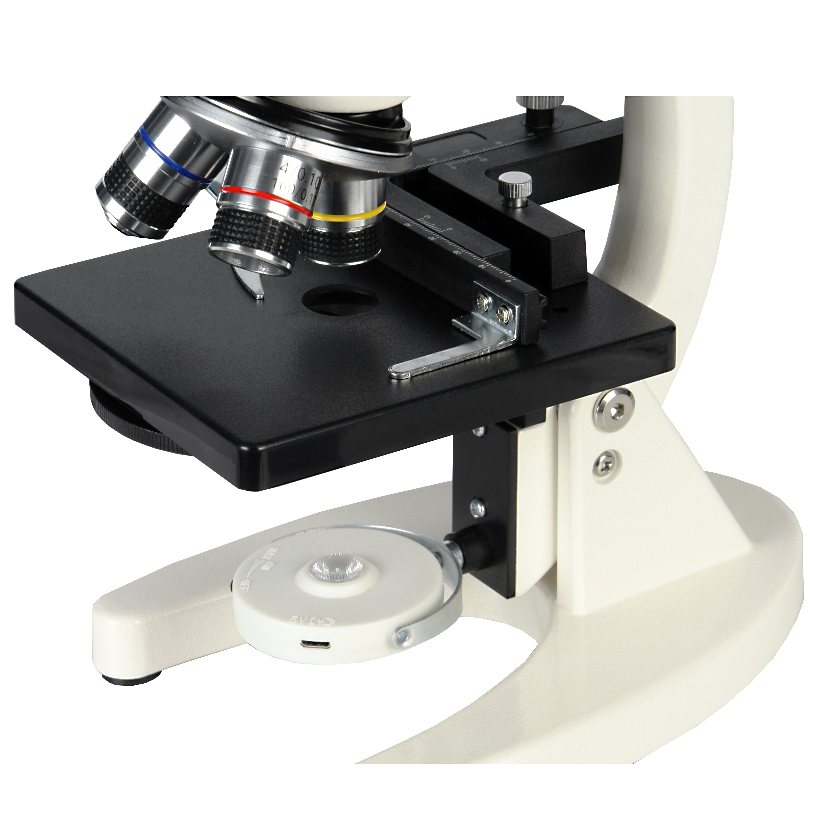 Для освещения исследуемого препарата используется поворотное зеркало со светодиодной подсветкой от встроенного аккумулятора. Микроскоп оборудован предметным столиком с механическим держателем для точного перемещения препарата во взаимно – перпендикулярных направлениях. С помощью микроскопа можно изучать срезы тканей, мазки, прозрачные минералы, кристаллы и многое другое.