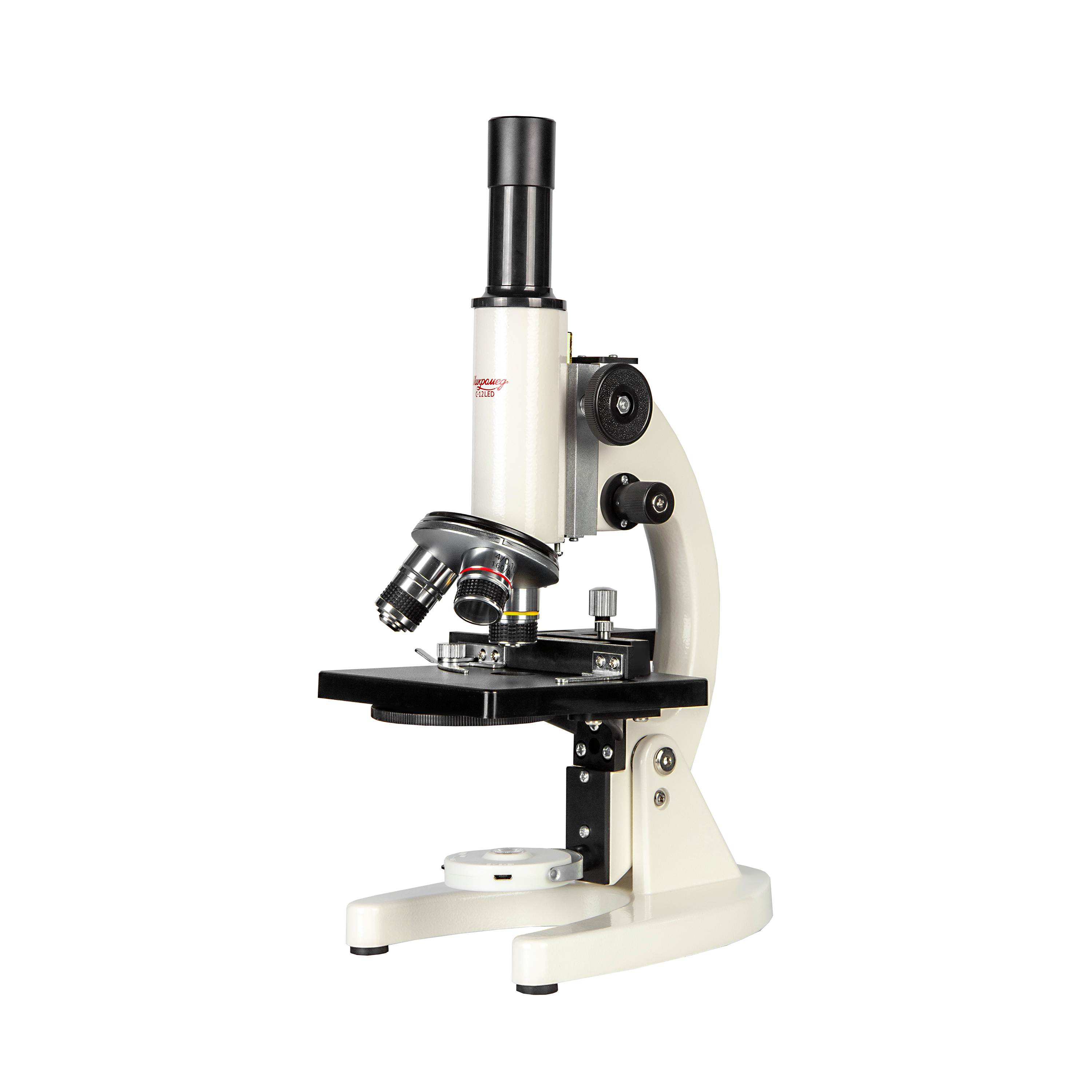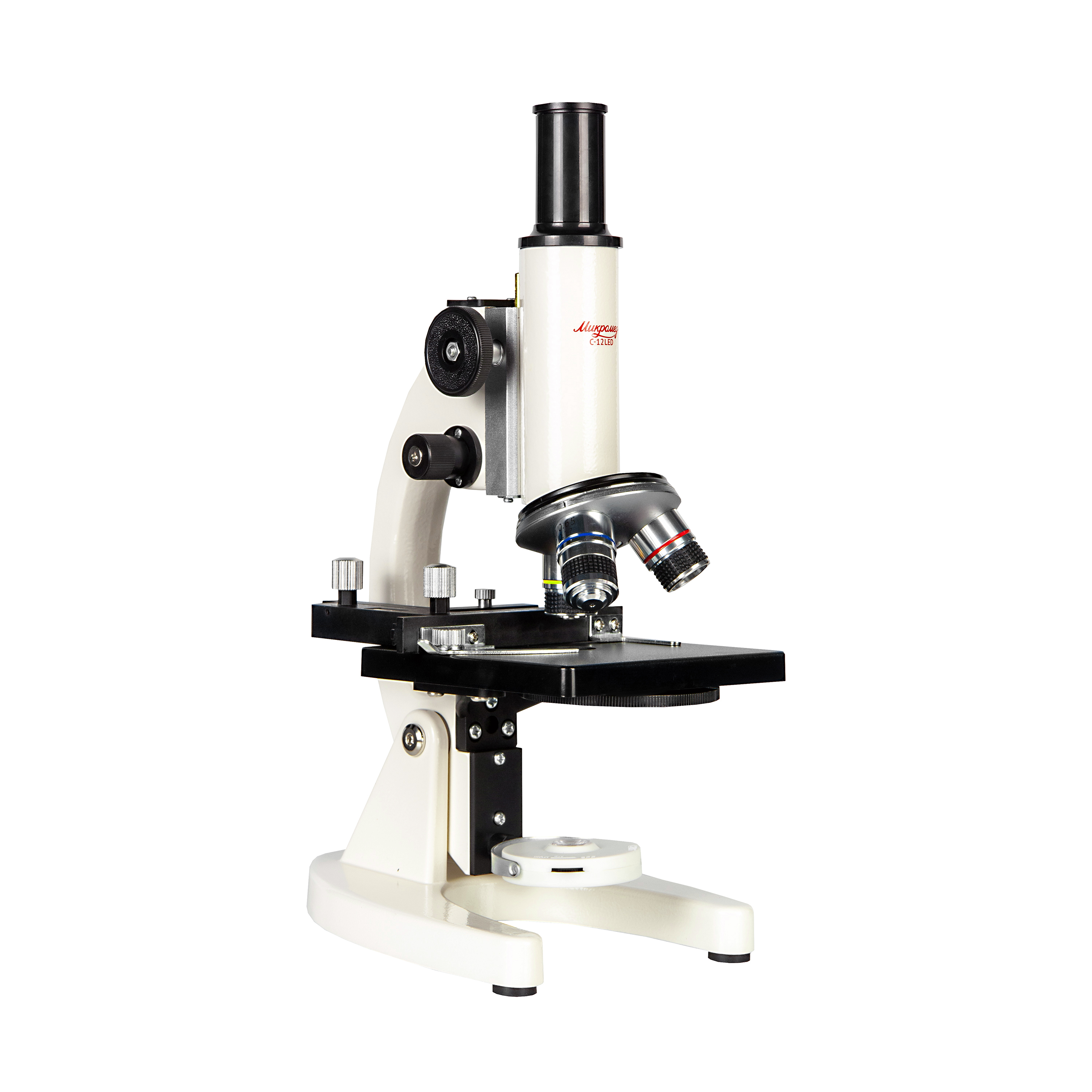 - Штатив микроскопа Микромед С-12 LED с основанием, предметным столиком с механическим держателем препарата, оптической головкой с тубусом и поворотным осветителем