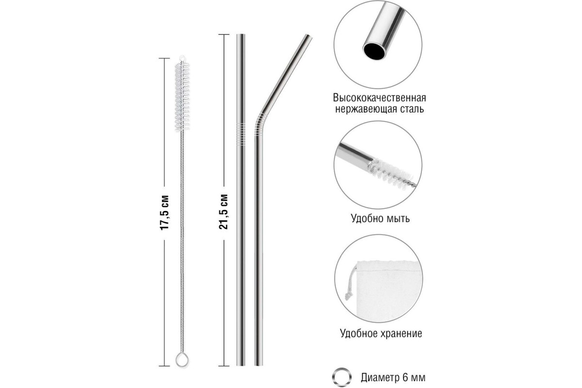 Многоразовые металлические трубочки RoadLike - новый тренд во всем мире. Забота об окружающей среде, неограниченный срок годности. Выполнены из нержавеющей пищевой стали, идеально подойдут для коктейлей и прочих прохладительных напитков: воды, лимонада, смузи, чая и кофе. Легко моются в посудомоечной машине, пригодны для повторного использования. Комплектация: 4 прямые трубочки, 4 изогнутые трубочки, 2 щетки, чехол. Длина 22 см, наружный диаметр 6 мм.