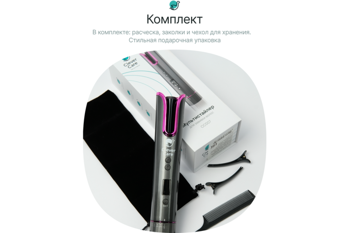 Получить идеальную укладку, не выходя из дома, стало еще проще вместе с новым стайлером CleverCare! Вы забудете о случайных ожогах, мешающих проводах, заломах на волосах и изнурительной процедуре укладки. Автоматическая плойка-мультистайлер создает локоны различной ширины и структуры, в зависимости от типа волос, случая и настроения (осуществляется посредством настроек температуры и времени воздействия). Подходит практически для любой длины и густоты волос всех типов. 4 температурных режима (150/170/190/200*С), 2 направления завивки, настраиваемое время воздействия (от 8 до 18 секунд), высокая емкость встроенной батареи (4800 мАч), компактный размер, быстрый разогрев и защита от перегрева делают мультистайлер CleverCare незаменимым помощником каждой девушки. Детальная пошаговая инструкция показана на изображениях, а также в инструкции пользователя. Попробовав данную плойку, вы не сможете от нее отказаться, ведь это наиболее простой, удобный и безопасный способ получить прическу мечты!
