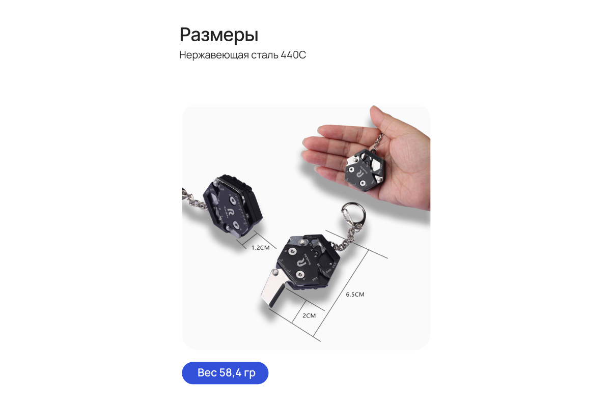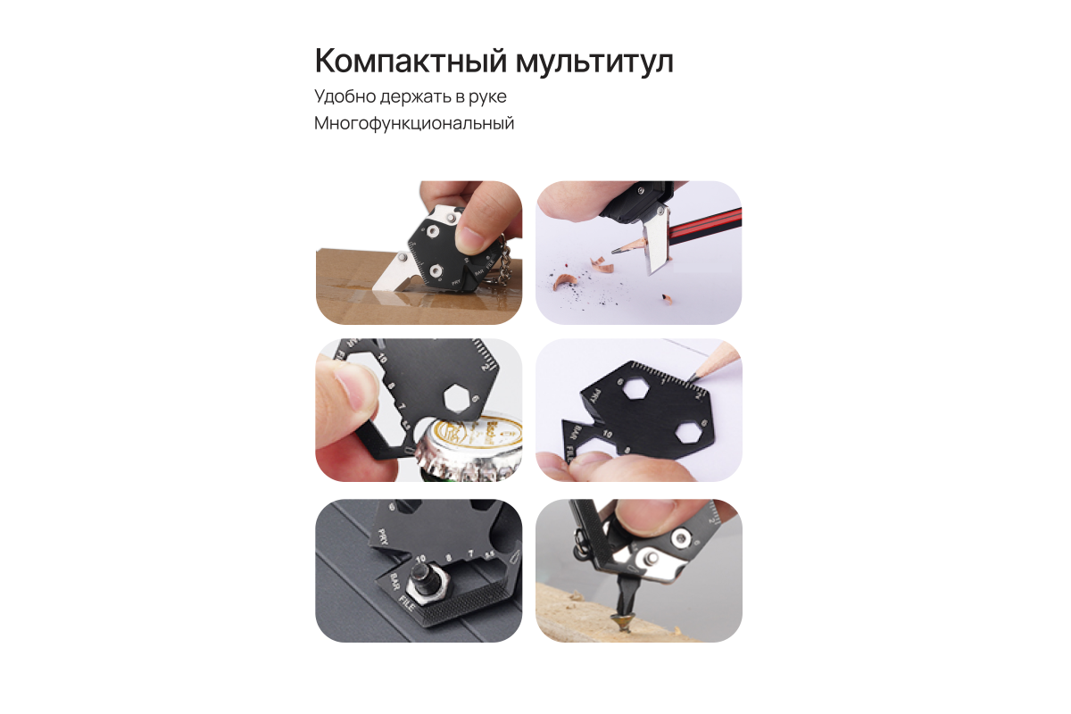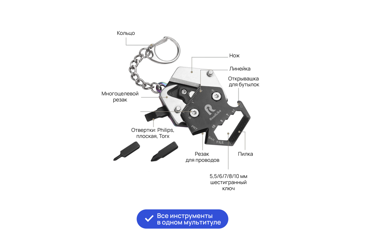 Мультитул карманный RoadLike RL002 10 в 1 незаменим во время активного отдыха и путешествий. Большой набор инструментов позволяет использовать модель RL002 для полноценного ремонта разнообразной техники. В комплект мультитула RoadLike RL002 входят следующие инструменты: 1 - Многоцелевой резак 2 - Нож 3 - Линейка 4 - Резак для проводов 5 - Пилка 6 - Открывалка для бутылок 7 - 5,5/6/7/8/10 мм шестигранный ключ 8 - Отвертка Philips 9 - Отвертка плоская 10 - Отвертка Torx Выполнены из нержавеющей стали 420С, отличаются высокой прочностью и твердостью, а также стойкостью к истиранию, коррозии и прочим видами механических воздействий. RoadLike - нам по пути!