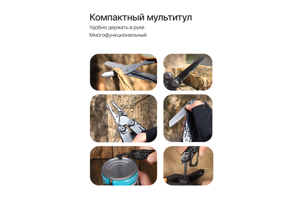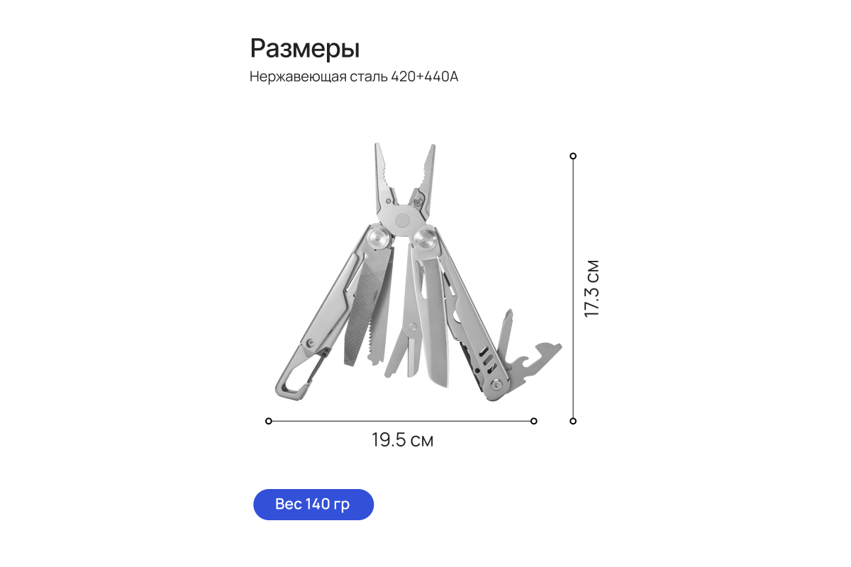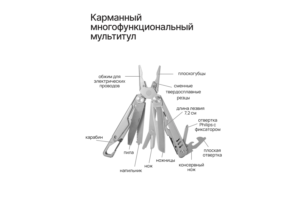 Мультитул RoadLike RL9 13 в 1 станет прекрасным помощником и заменит собой целый ящик с инструментам. Большой набор инструментов позволяет использовать модель RL9 для полноценного ремонта разнообразной техники. В комплект мультитула RoadLike RL9 входят следующие инструменты: Плоскогубцы, Кусачки для твердой проволоки, Обжим для электрических проводов, Нож, Ножницы, Многоцелевой резак, Открывалка для бутылок с плоской отверткой, Консервный нож с плоской отверткой, Отвертка Philips с фиксатором, Пилка для ногтей, Пила напильник. Выполнены из нержавеющей стали 440С, отличаются высокой прочностью и твердостью, а также стойкостью к истиранию, коррозии и прочим видами механических воздействий.
