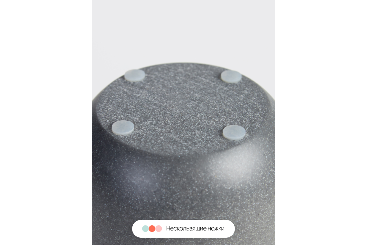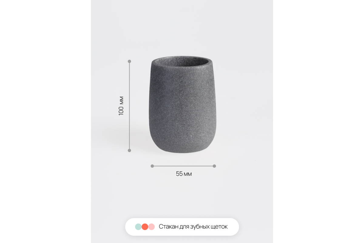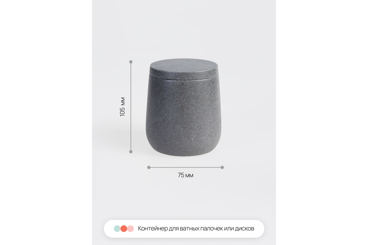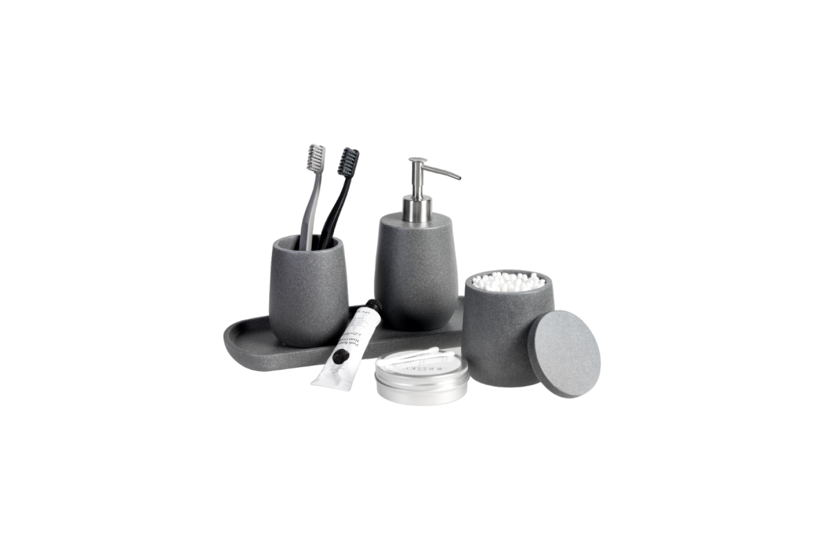 Набор аксессуаров для ванной серый Granite состоит из четырех предметов: дозатор для жидкого мыла, стакан для зубных щеток, контейнер органайзер для ватных палочек или дисков с крышкой, а также поднос, который можно использовать как подставку для набора в ванную, так и для любой косметики, полотенец для лица, свечей и т.д.