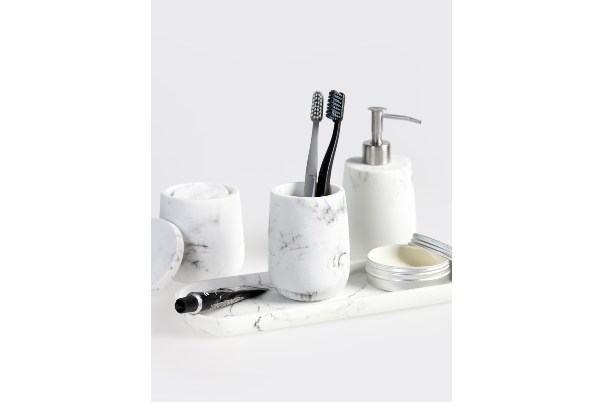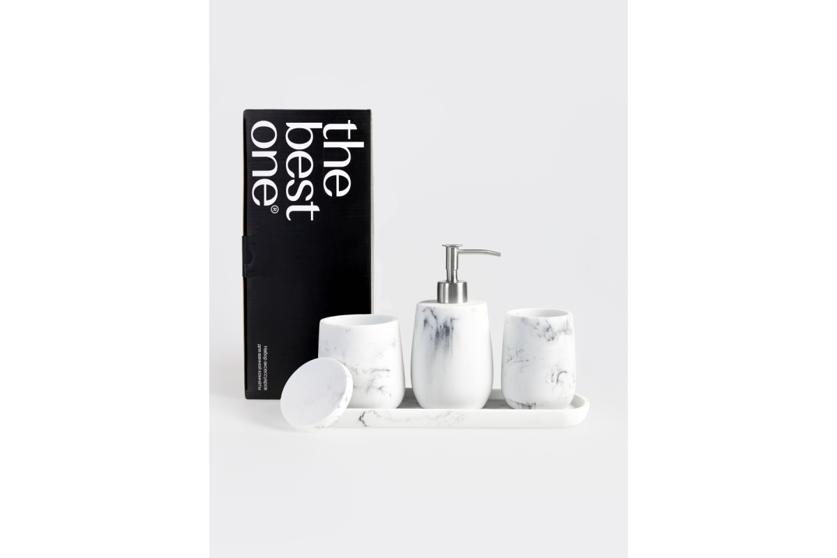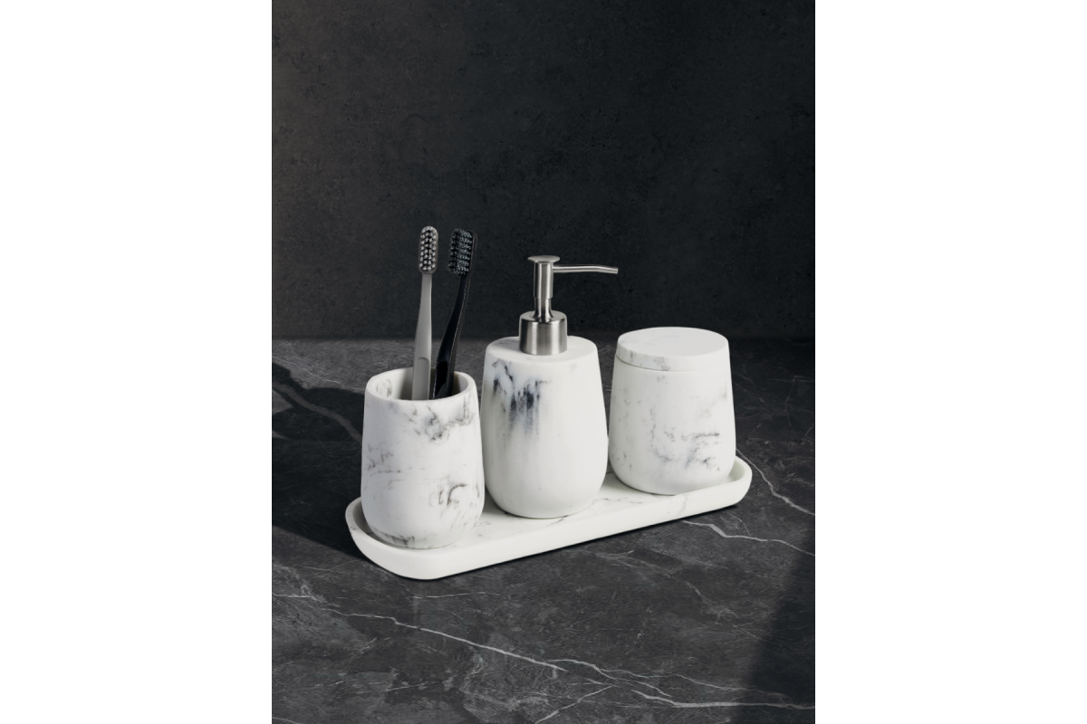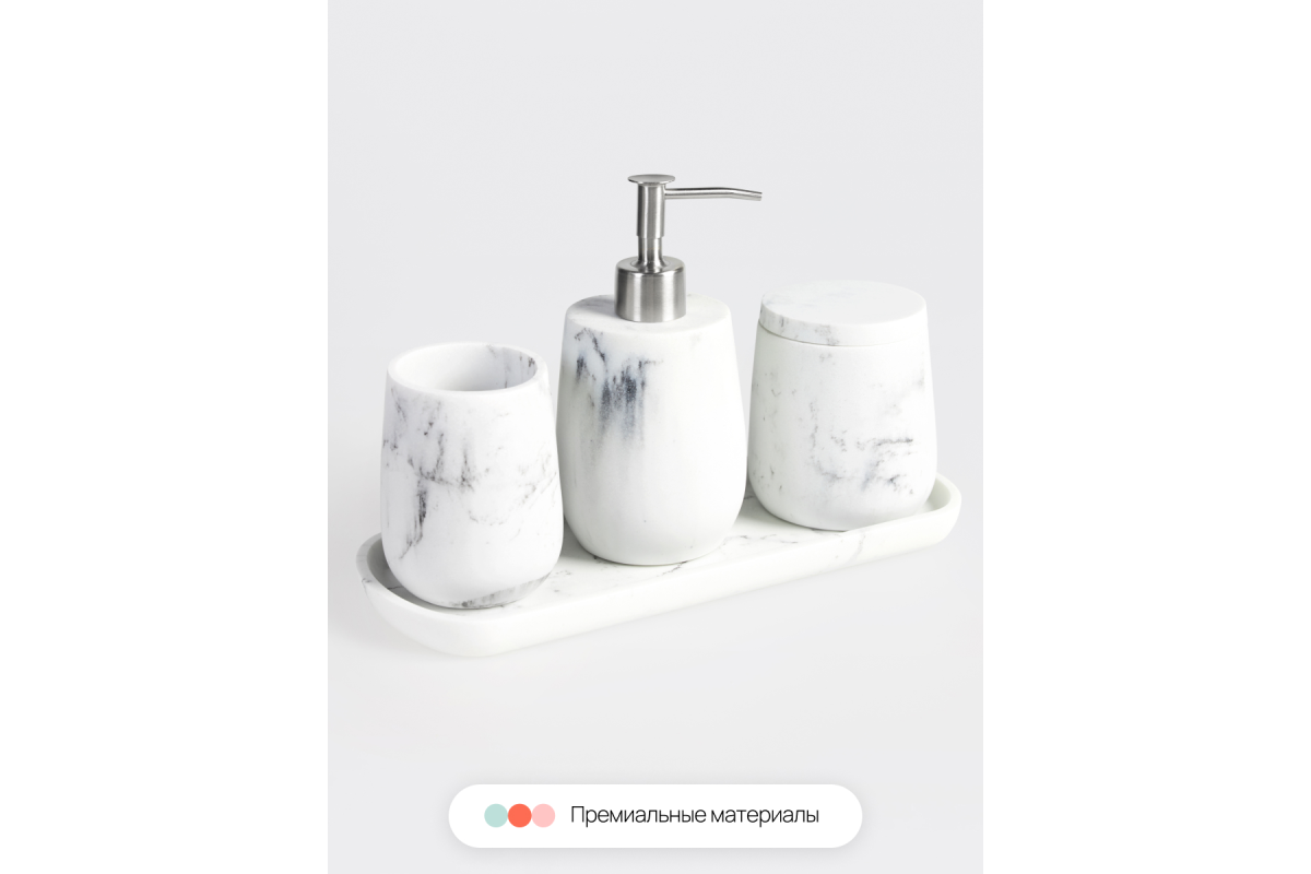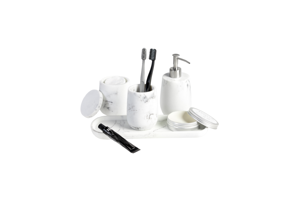Набор аксессуаров для ванной Marble мрамор состоит из четырех предметов: дозатор для жидкого мыла, стакан для зубных щеток, контейнер органайзер для ватных палочек или дисков с крышкой, а также поднос, который можно использовать как подставку для набора в ванную, так и для любой косметики, полотенец для лица, свечей и т.д.