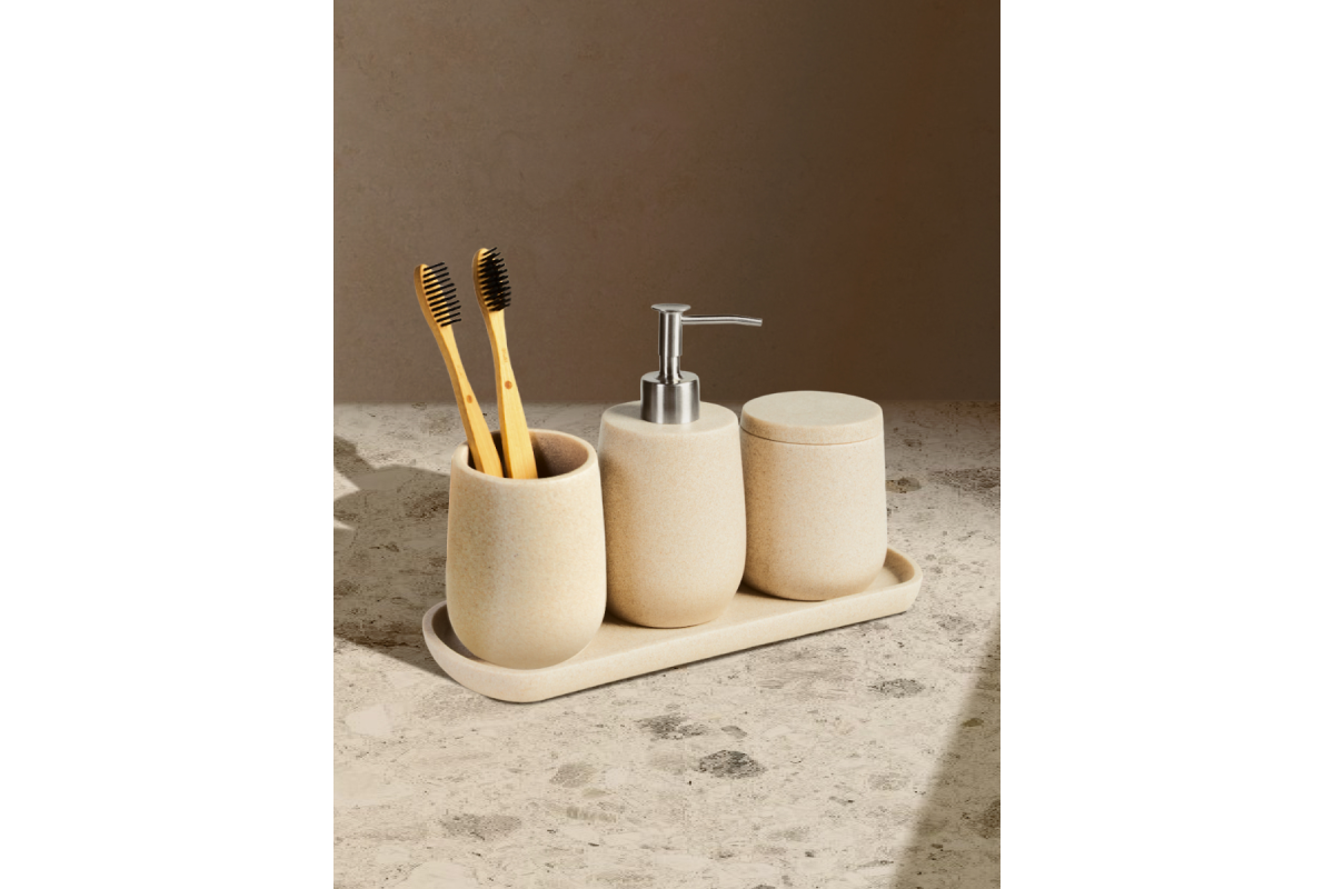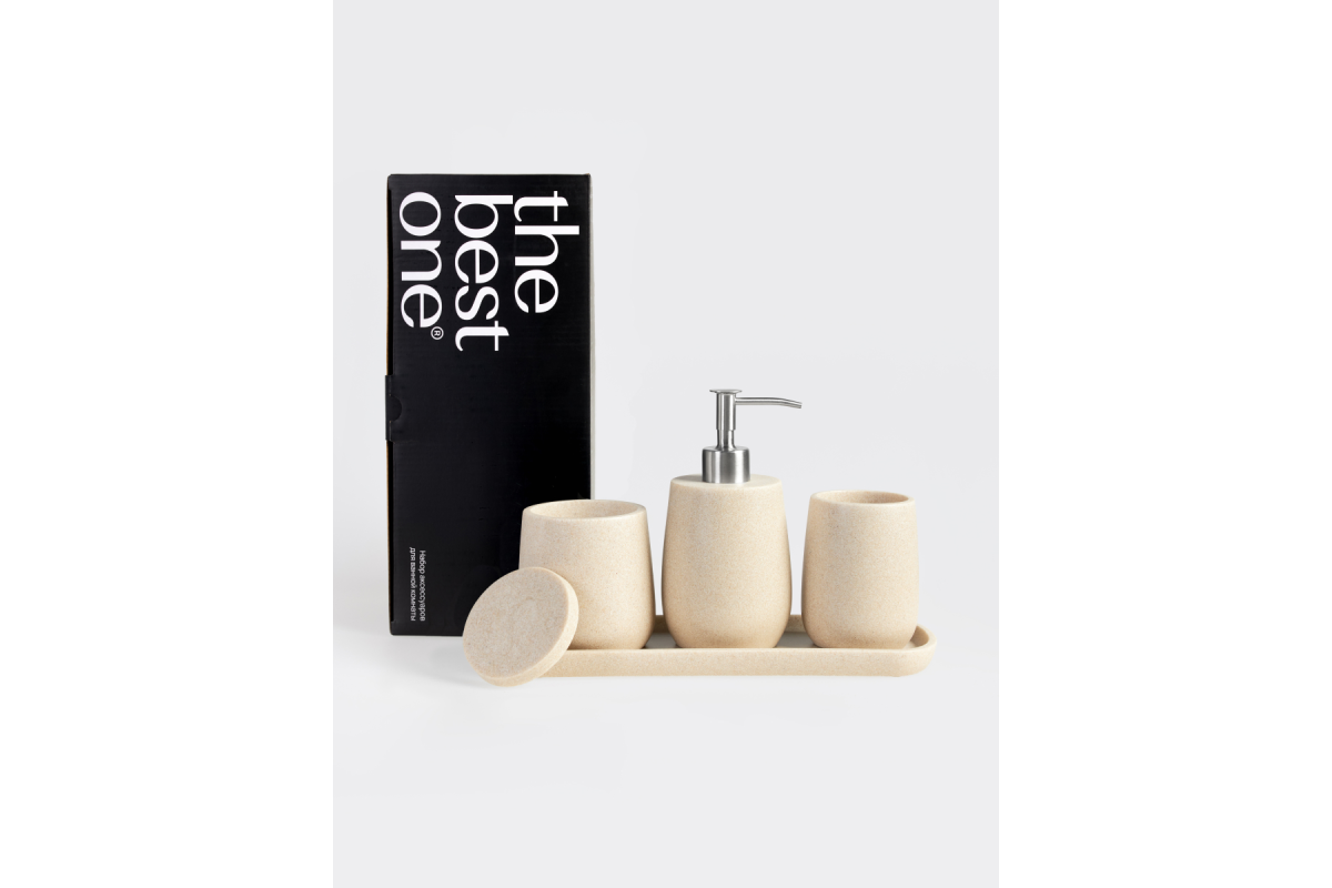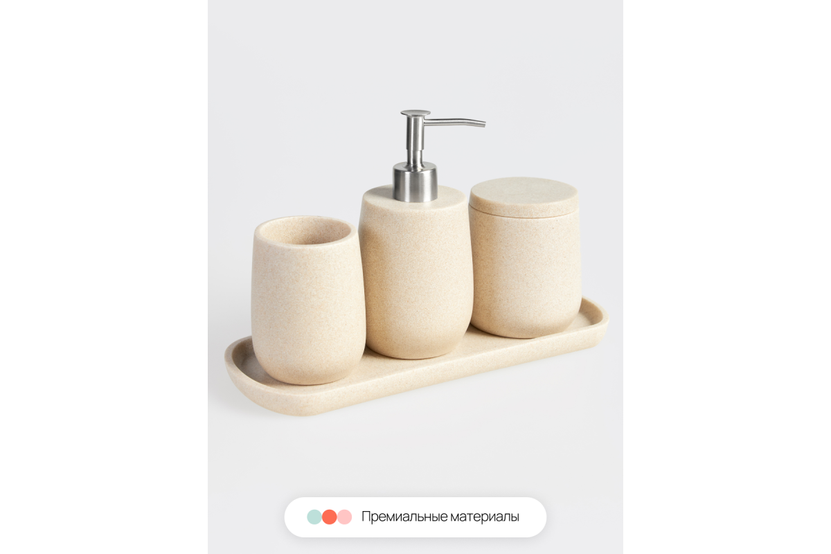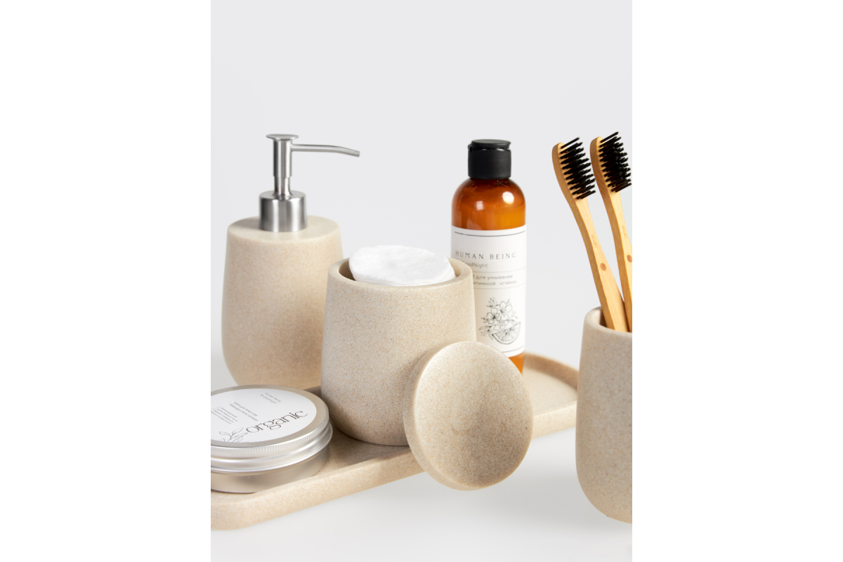 Набор аксессуаров для ванной Sandstone бежевый состоит из четырех предметов: дозатор для жидкого мыла, стакан для зубных щеток, контейнер органайзер для ватных палочек или дисков с крышкой, а также поднос, который можно использовать как подставку для набора в ванную, так и для любой косметики, полотенец для лица, свечей и т.д.