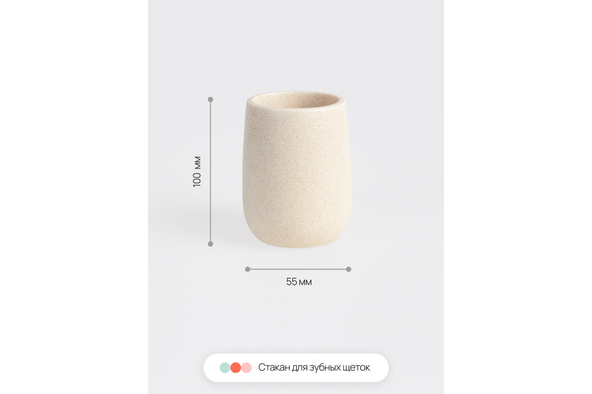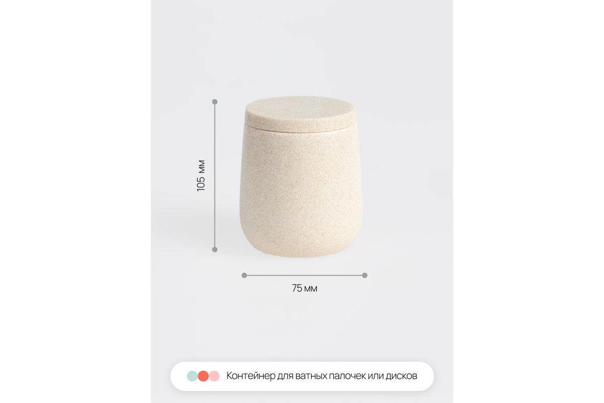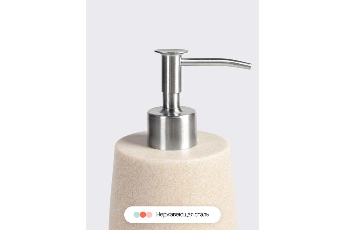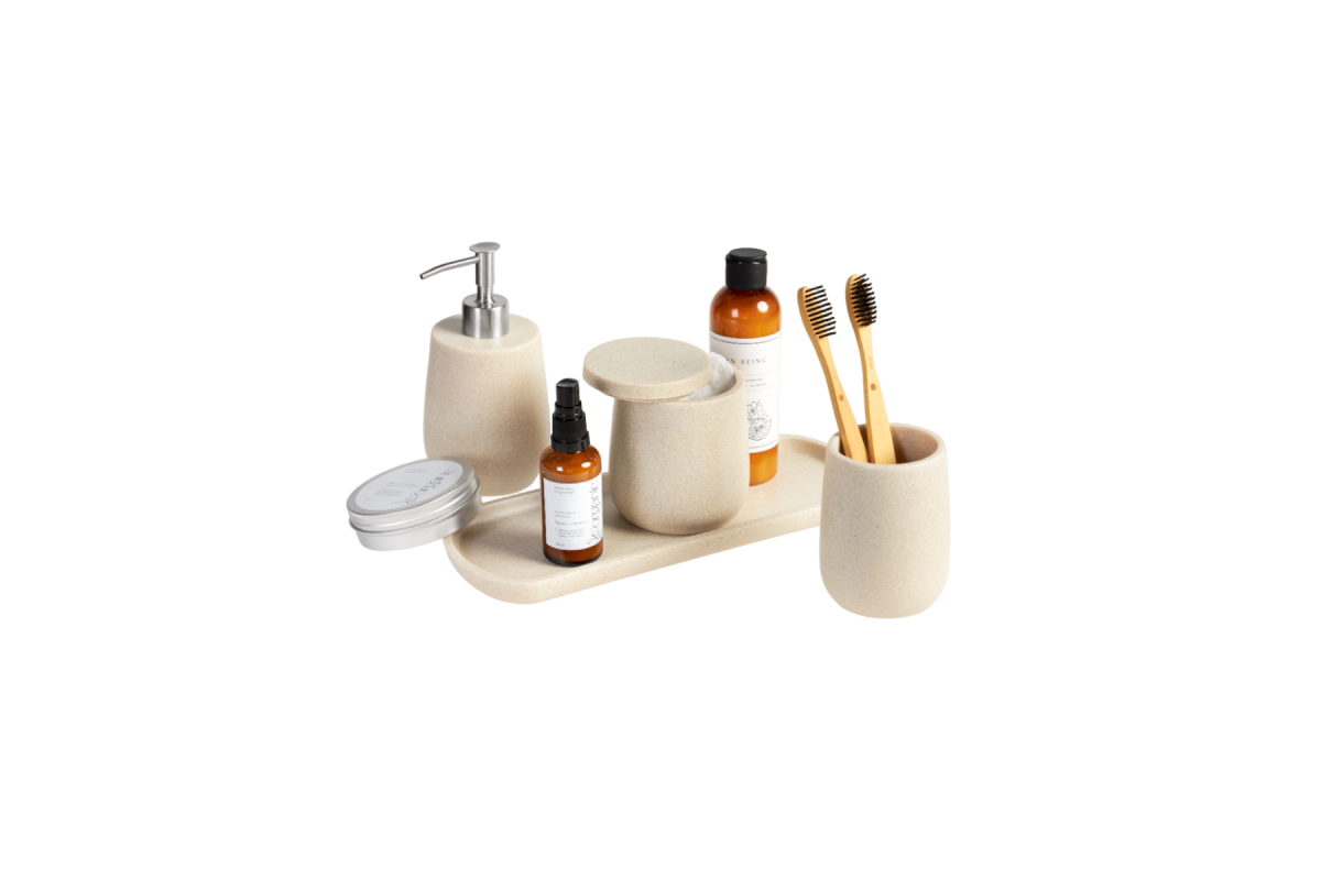 Набор аксессуаров для ванной Sandstone бежевый состоит из четырех предметов: дозатор для жидкого мыла, стакан для зубных щеток, контейнер органайзер для ватных палочек или дисков с крышкой, а также поднос, который можно использовать как подставку для набора в ванную, так и для любой косметики, полотенец для лица, свечей и т.д.
