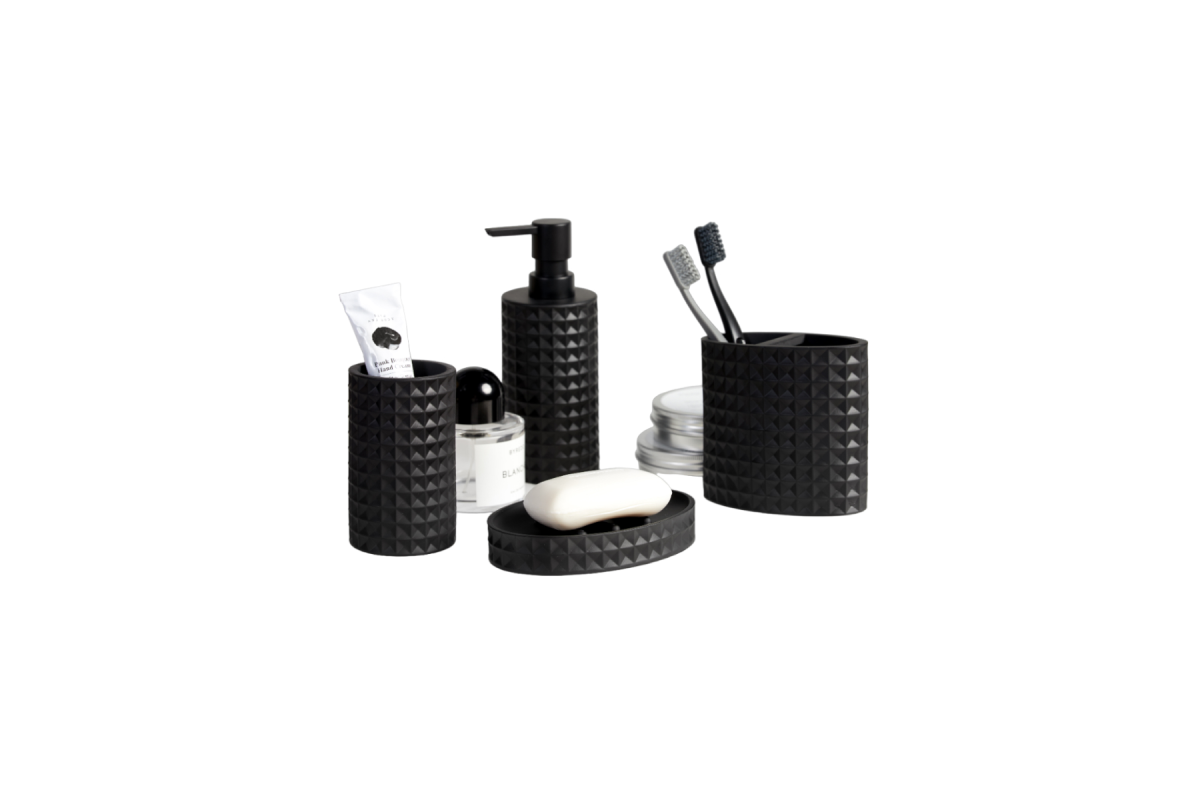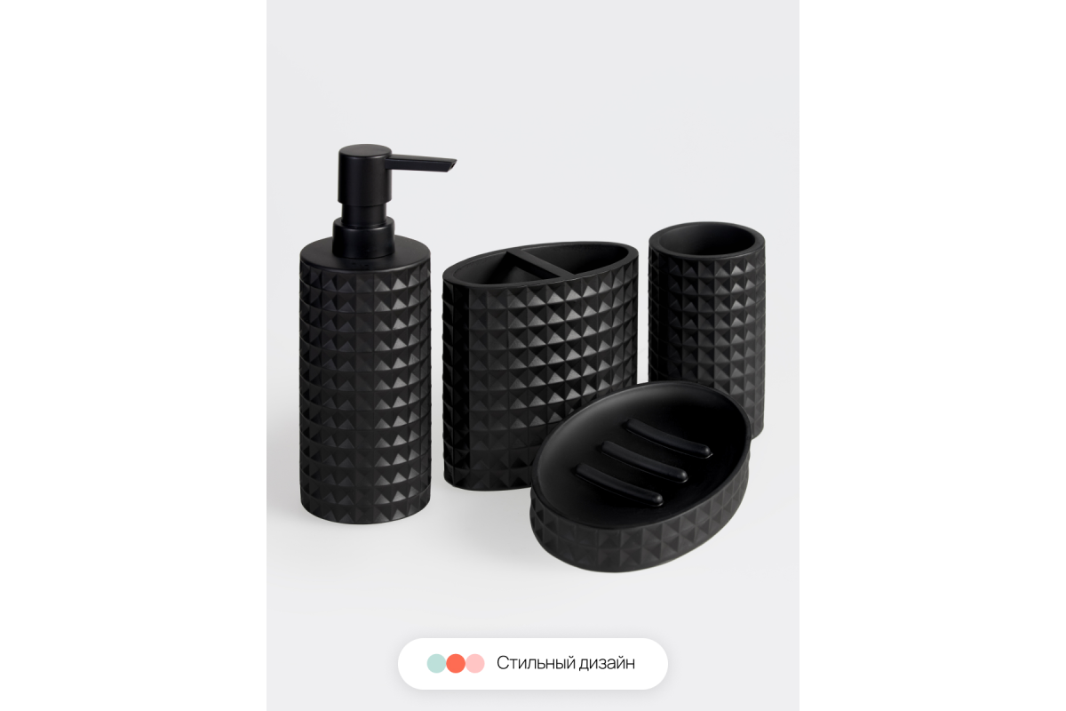 Аксессуары для ванной комнаты выполнены из современного инновационного материала полирезина, который в отличии от других материалов устойчив к влажности, внешним воздействиям, не бьется. Помпа дозатора изготовлена из высококачественного пластика. Все аксессуары для ванной набор имеют силиконовые антискользящие ножки накладки, которые не позволяют предметам скользить по влажной или мокрой поверхности. Матовые, тактильно приятная принадлежности для ванной выглядят дорого и стильно. Такой набор в ванную комнату красив, практичен и прослужит долгие годы.