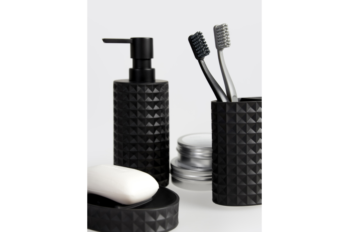 Набор аксессуаров для ванной Waffle молочный состоит из четырех предметов: дозатор для жидкого мыла, стакан для зубных щеток, контейнер органайзер для ватных палочек или дисков с крышкой, а также мыльница.