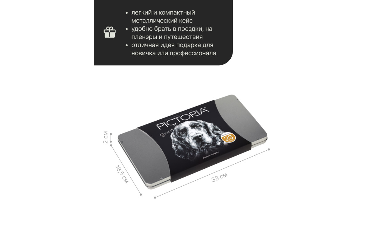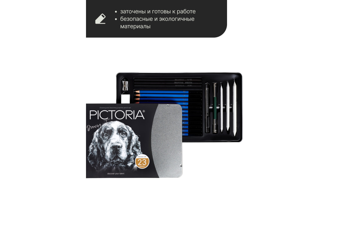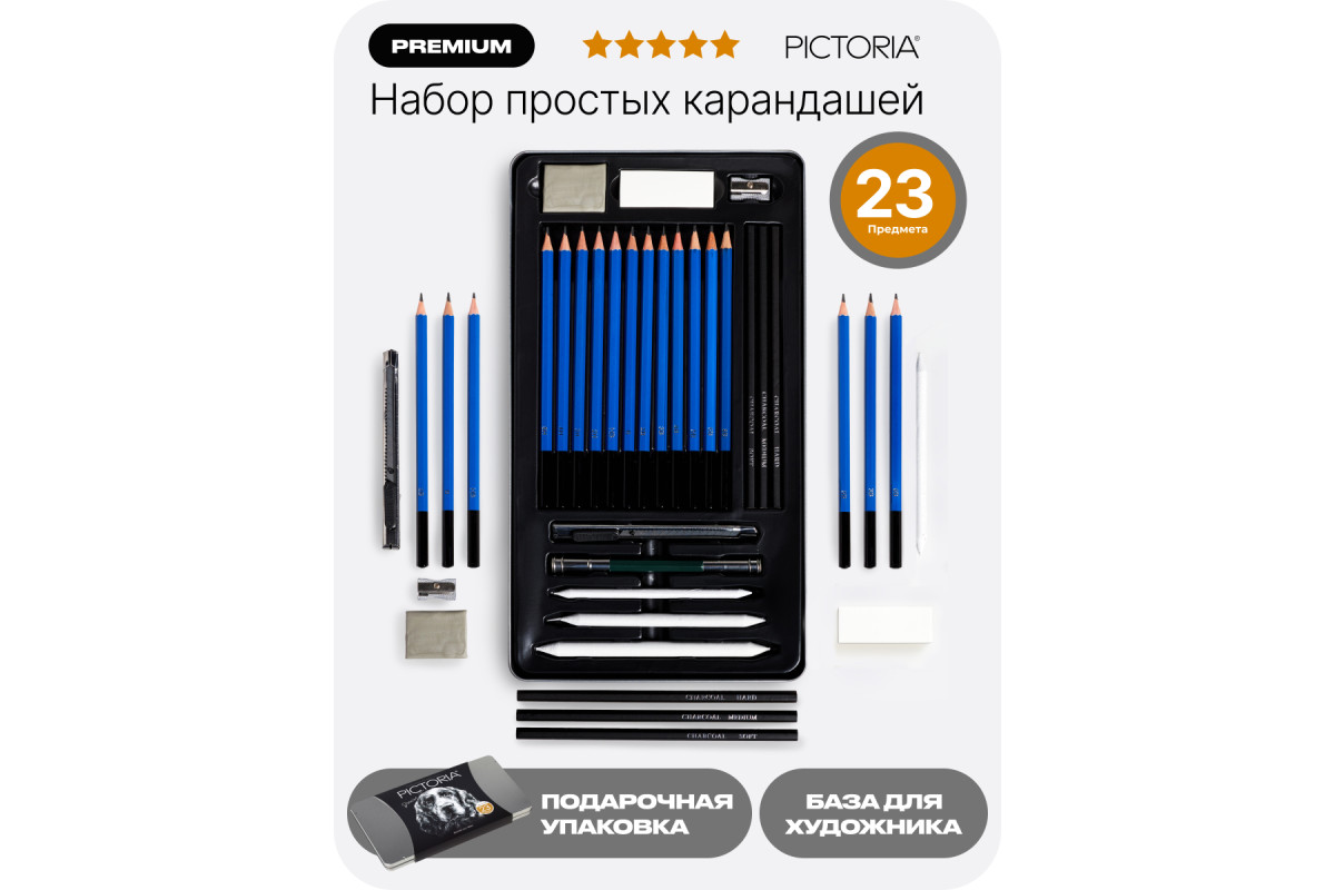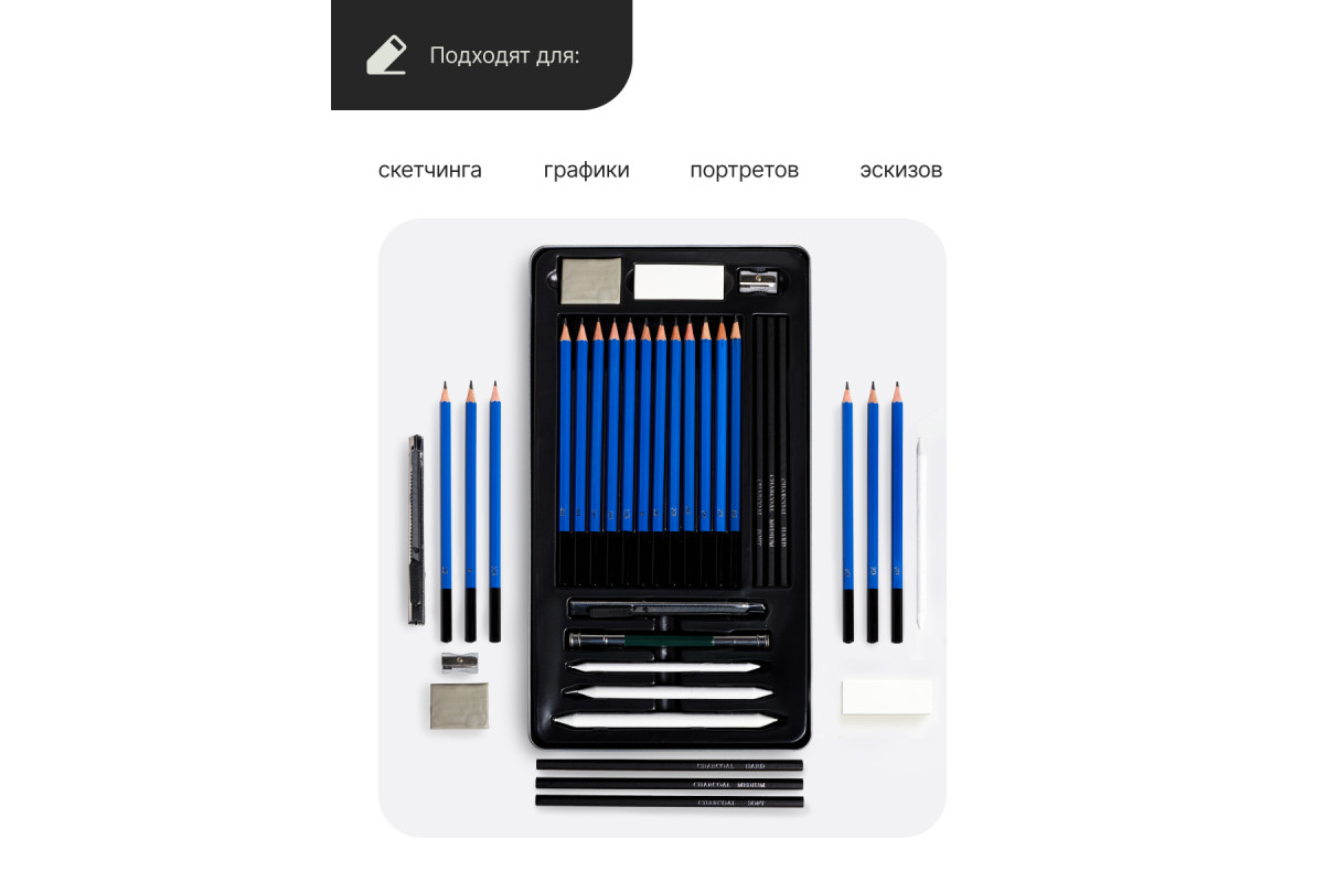 В наборе для рисования также присутствуют угольные карандаши, которые добавляют изображению дополнительный эффект и глубину. Карандаши простые Pictoria изготовлены из высококачественных материалов, что гарантирует долговечность и удобство использования. Они подходят для работы как с обычной бумагой, так и с специальными блокнотами для скетчинга. Металлическая коробка защищает карандаши от повреждений и позволяет легко хранить и транспортировать набор. Благодаря своей компактности, этот набор можно брать с собой в поездки или на прогулки, чтобы в любой момент можно было начать творить и создавать настоящие шедевры.