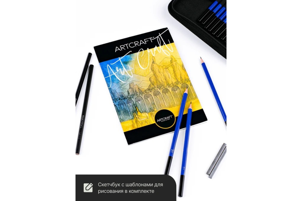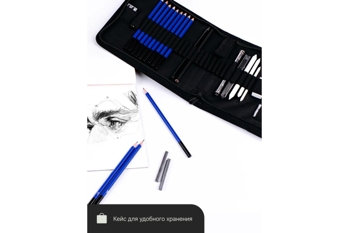 В комплект входят: 12 шт. Графитовых карандашей с разной твердостью от 5H (твердый) до 8B (мягкий) 3 шт. Угольных карандаша разной твердости (твердый, средний, мягкий) 3 шт. Угольных стержня разной твердости (твердый, средний, мягкий) 3 шт. Графитовых стержня разной твердости (твердый, средний, мягкий) 3 шт. Бумажных карандаша для растушевки малого и среднего размера 1 шт. Двойная металлическая точилка для карандашей 1 шт. Пластиковая точилка для карандашей 1 шт. Бескорпусный графитовый карандаш 6В 1 шт. Нож художника 1 шт. Удлинитель для карандашей 1 шт. Ластик 1 шт. Ластик художника - "клячка" 1 шт. Блок наждачной бумаги 1 шт. Скетчбук Discover your talent!