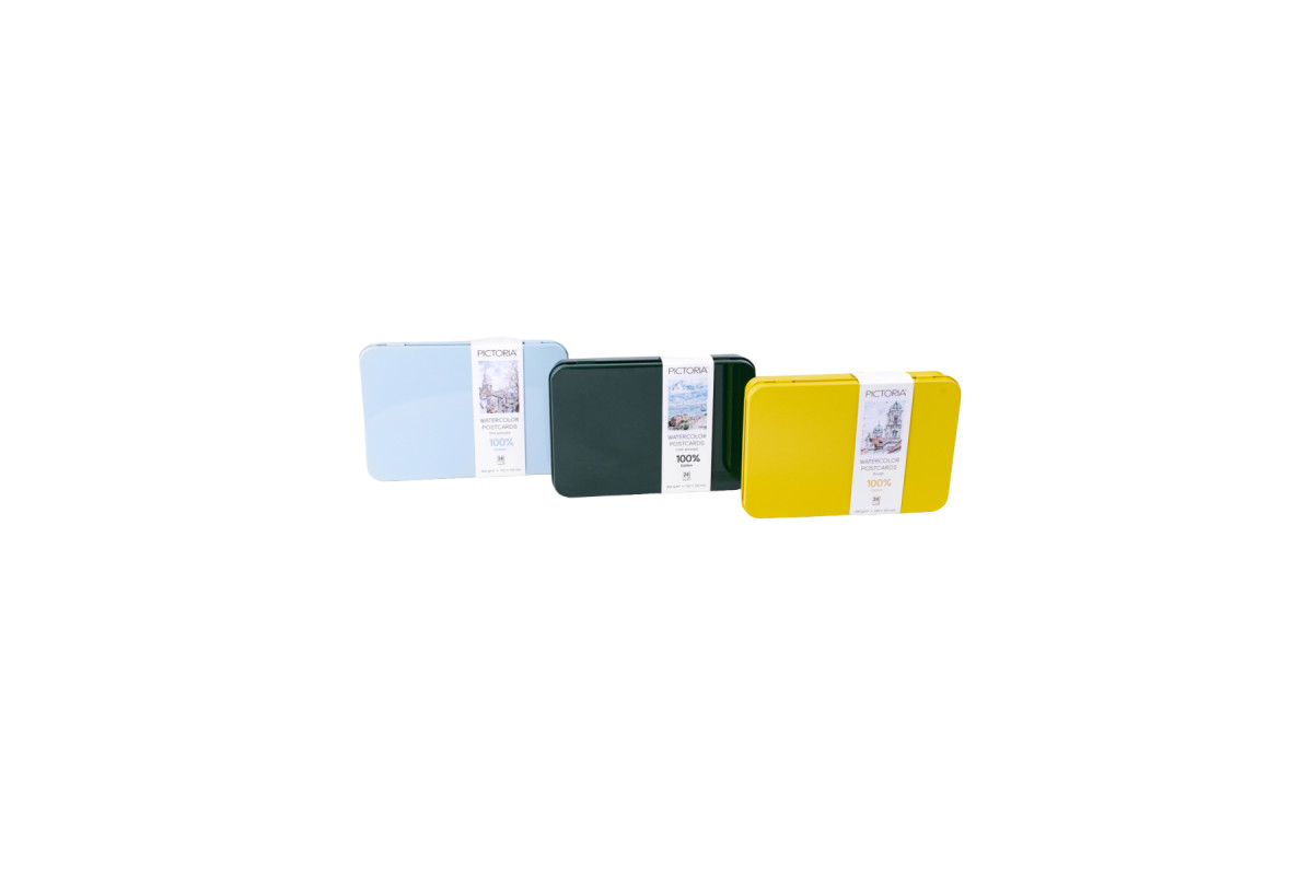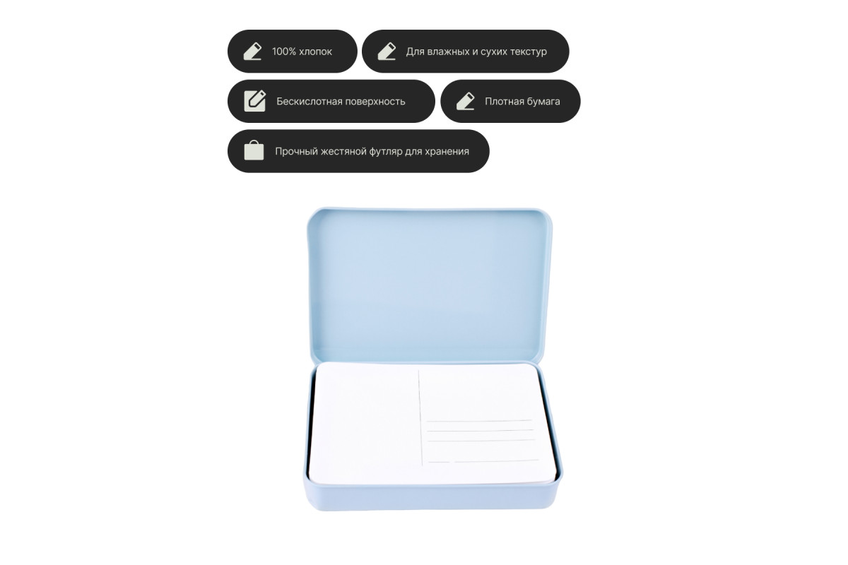 Набор открыток акварельной бумаги Pictoria — лучший способ создать праздничные открытки, приглашения, личные сообщения для родных и друзей и просто акварельные миниатюры. Карточки из 100% хлопка, обеспечивают идеальную поверхность для акварели, кистей, маркеров, ручек и линеров. Бумага плотностью 300 гр/м2 выдерживает не только нанесение разбавленной краски но и смывку, а бескислотная поверхность сохранит рисунки, не позволит им пожелтеть или выцвести со временем. Акварельная бумага упакована в прочный жестяной футляр, который сохранит листы от повреждений, а компактный размер позволит творить где угодно!