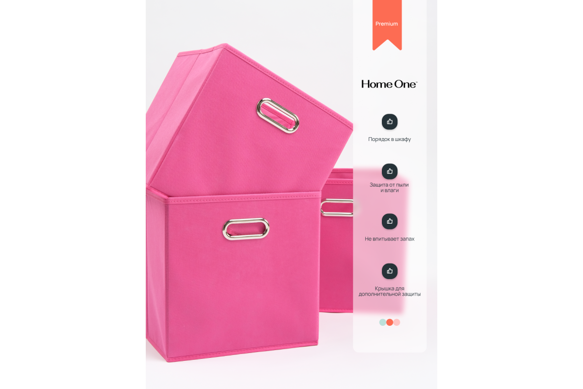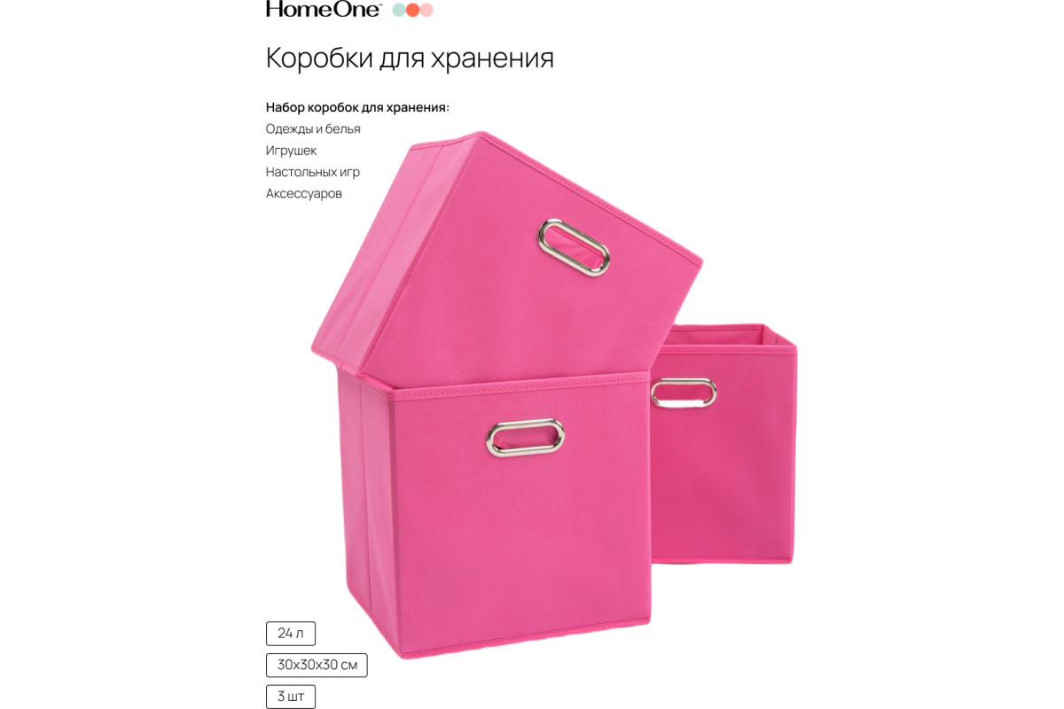 Набор коробок для хранения Home One предназначен для хранения одежды, белья, игрушек, канцтоваров, косметики и различных мелочей. Коробки легко складывается и раскладывается, имеют жесткое дно, отлично держат форму без заполнения вещами. Изготовлены из прочного, практичного материала. Можно применять для разнообразных целей: контейнер для хранения, коробка для хранения, корзина для белья, органайзер для хранения вещей, органайзер, коробка, корзина, корзинка. Удобна для использования в любом месте квартиры: прихожая, гостиная, детская или спальня. Размер 30х30х30 см. Объем 24 л. Набор коробок для хранения Home One станет отличным подарком на новоселье, для друзей или родственников.