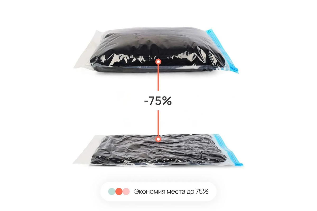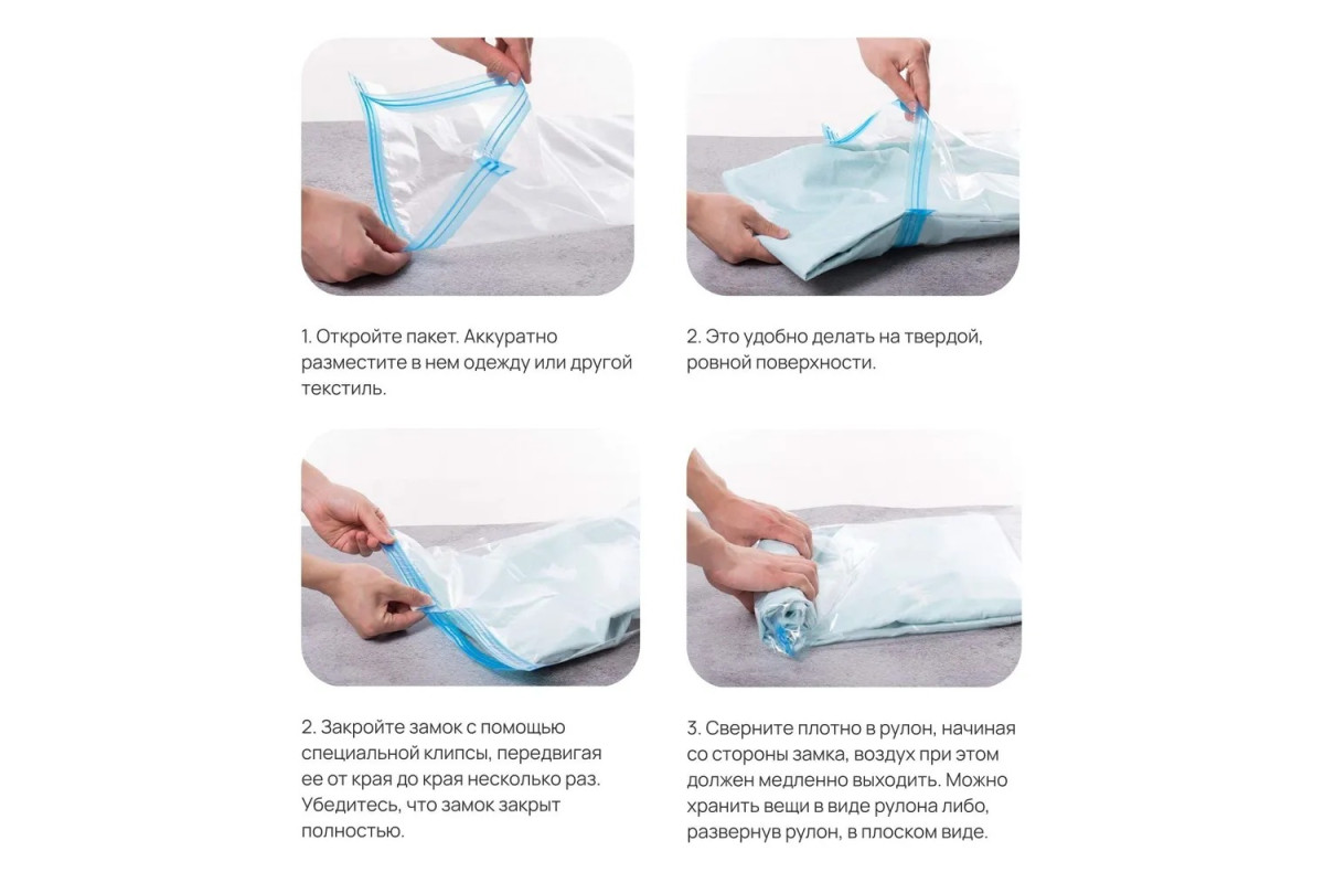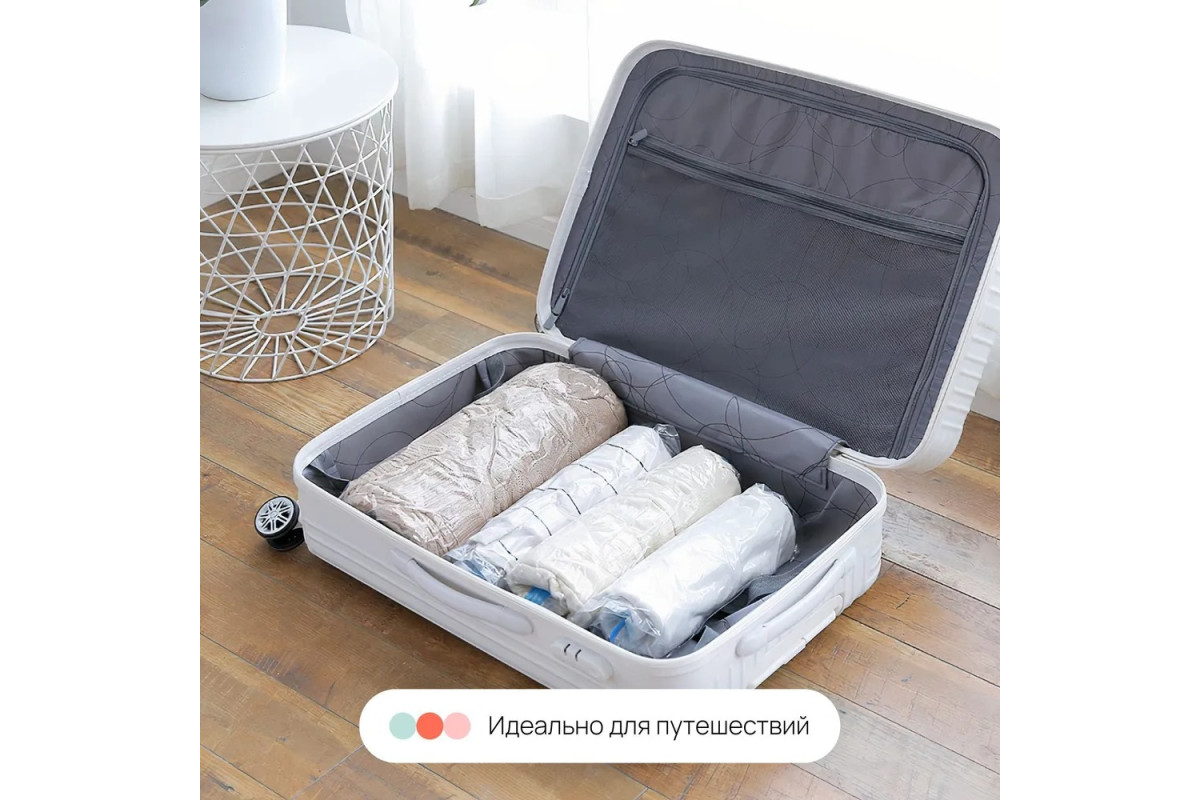 Вакуумные пакеты без клапана - это отличное решение для экономии пространства при хранении вещей, одежды, белья, игрушек, шуб, верхней одежды. Набор содержит большие вакуумные пакеты 50х70 см и средние 40 х 50 см. Вакуумные мешки позволяют экономить до 75% места в шкафу. Применяются как упаковочные пакеты для переезда, которые позволяют уменьшать объем вещей, багажа и компактно складывать вещи в чемодан при путешествии , путем скукрчивания пакетов вручную. Служат надежной защитой для вещей от пыли, влаги, запахов, плесени и насекомых. Для использования пакетов не требуется насос, пылесос, что комфортно в путешествиях или поездках. Пакеты прозрачные, герметичные, влагостойкие с замком zip-lock. Позвольте себе легко решить вопрос хранения, освободите место в своем гардеробе и шкафу с брендом Home One!