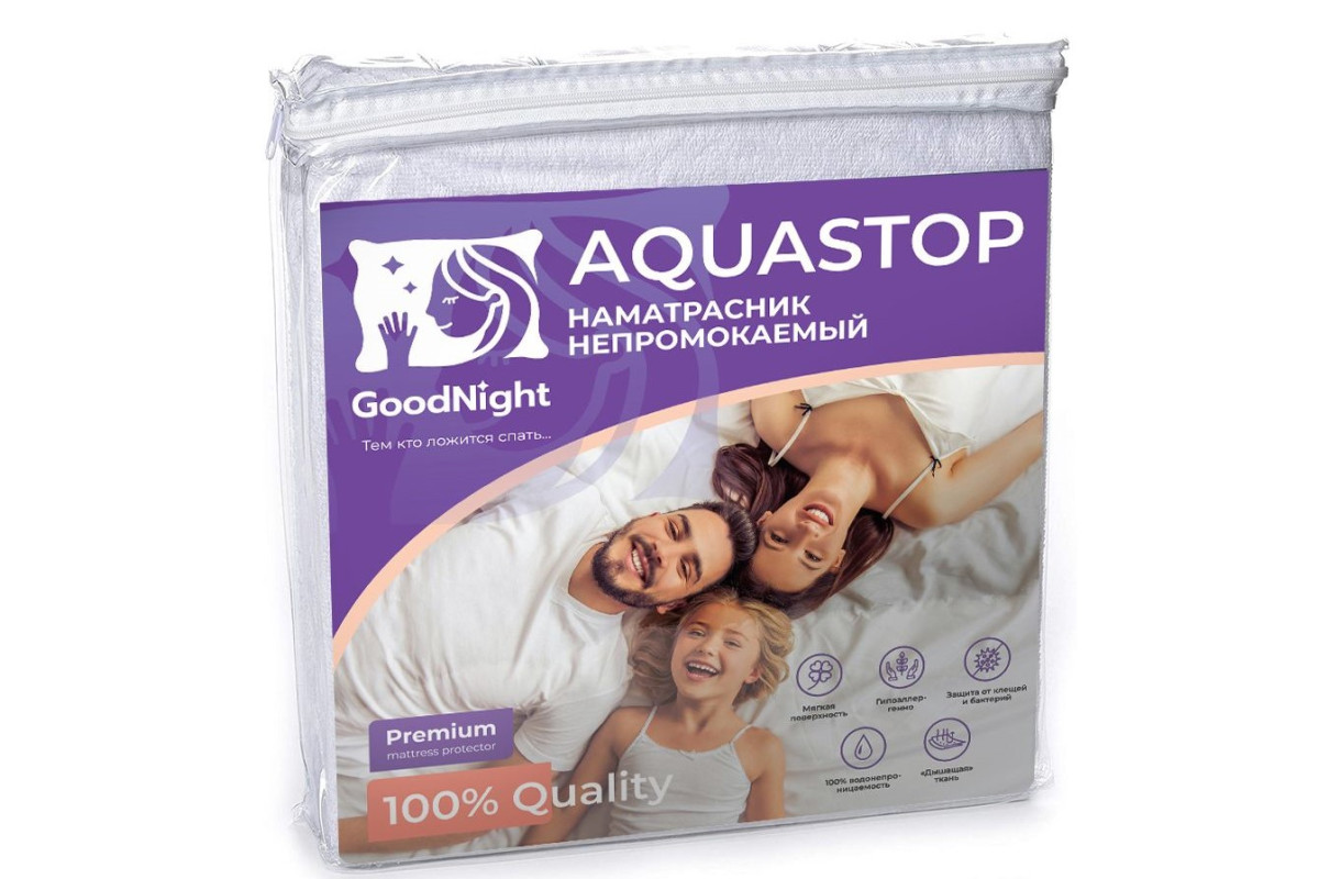 Наматрасник махровый непромокаемый GoodNight Aquastop серии Comfort с натяжной резинкой по всей длине - идеальная и надежная защита Вашего матраса. Лицевая сторона, выполненная из махровой ткани (80% хлопок, 20% полиэстер), защищает от пылевых клещей, аллергенов, бактерий и позволяет циркулировать воздуху. Внутренний слой - полиуретановая мембрана из водонепроницаемого гипоаллергенного полотна. Наматрасник рассчитан на матрасы 180 см х 200 см с высотой борта до 30 см. Машинная стирка при температуре до 40 С.