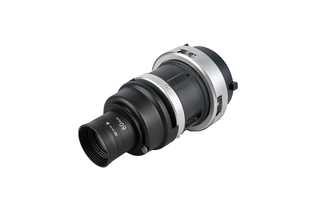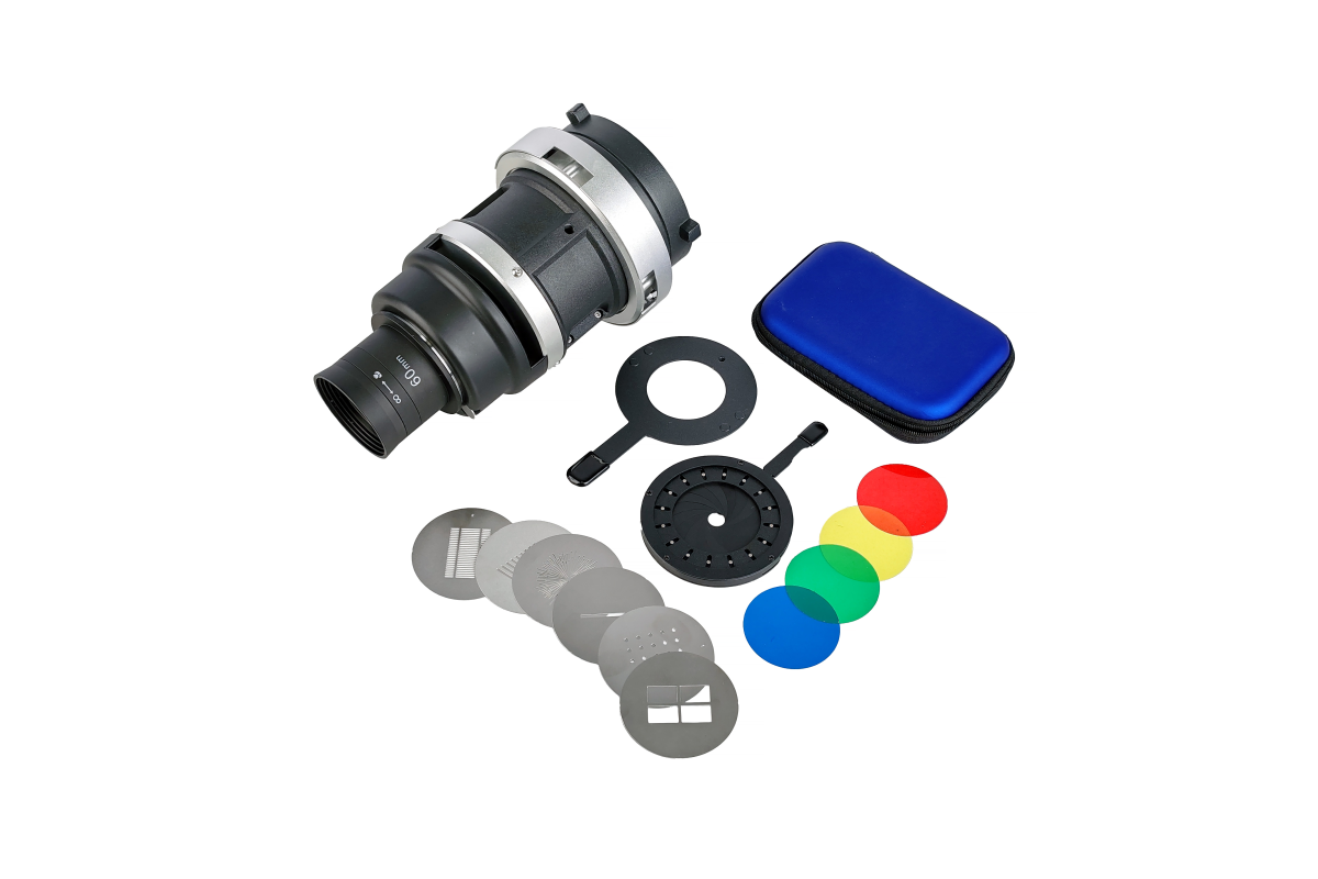 Фокусируемый объектив 60 мм устанавливается на байонет Canon EF и создает круг света с четкими краями без обесцвечивания или эффекта ореола (с данной насадкой можно использовать и другие объективы с байонетом Canon EF). Проекционный объектив с системой фокусировки позволяет регулировать степень размытия границ формируемого контура.
