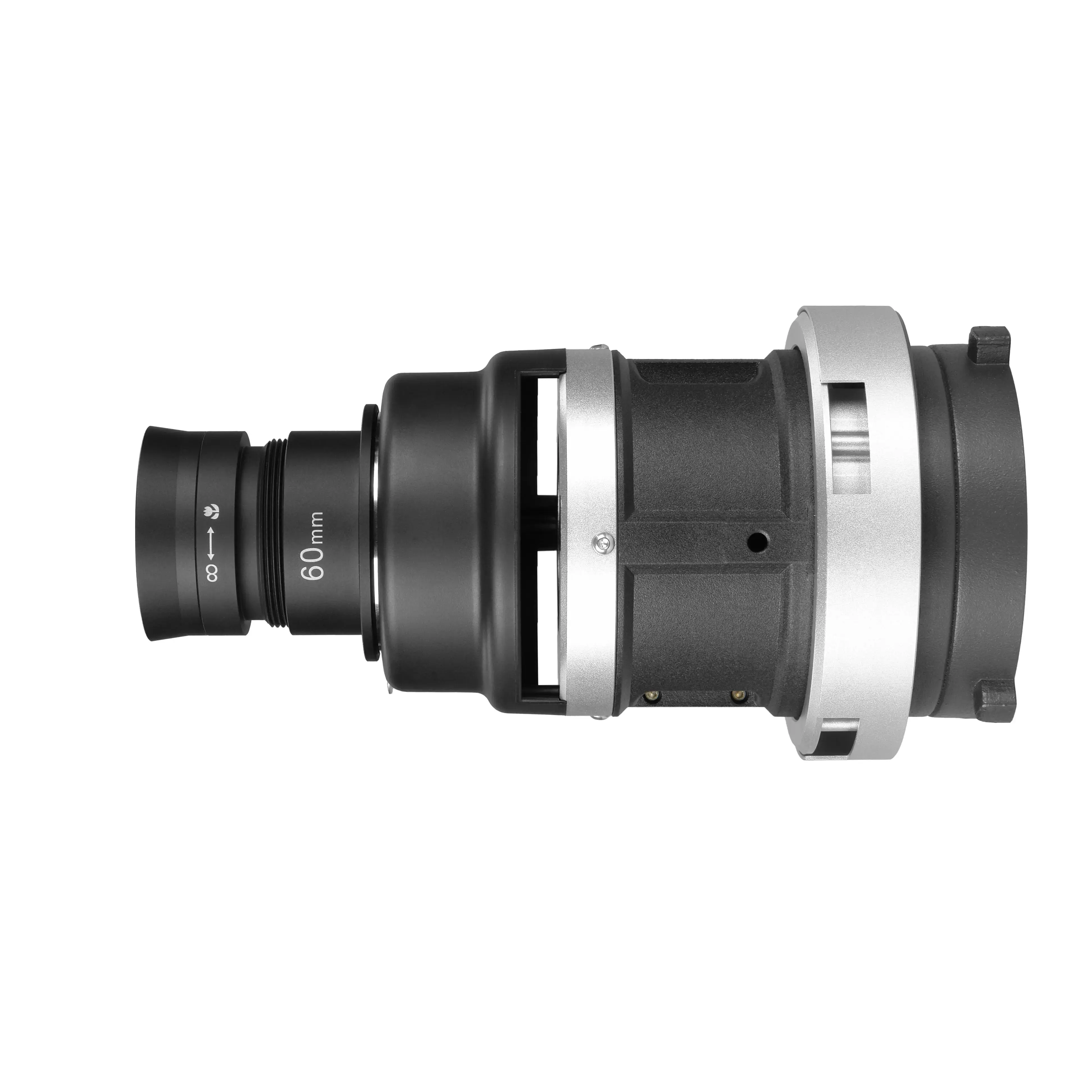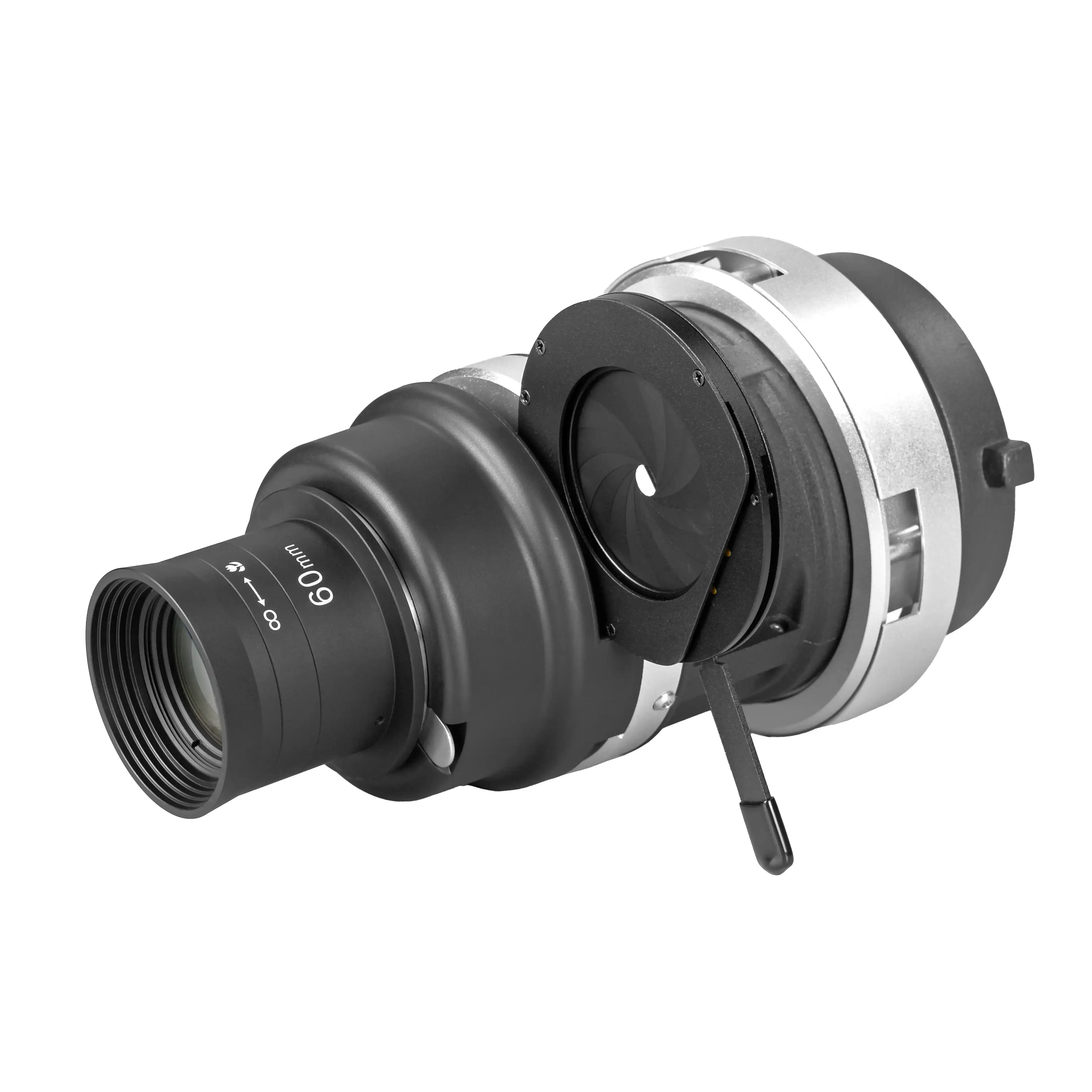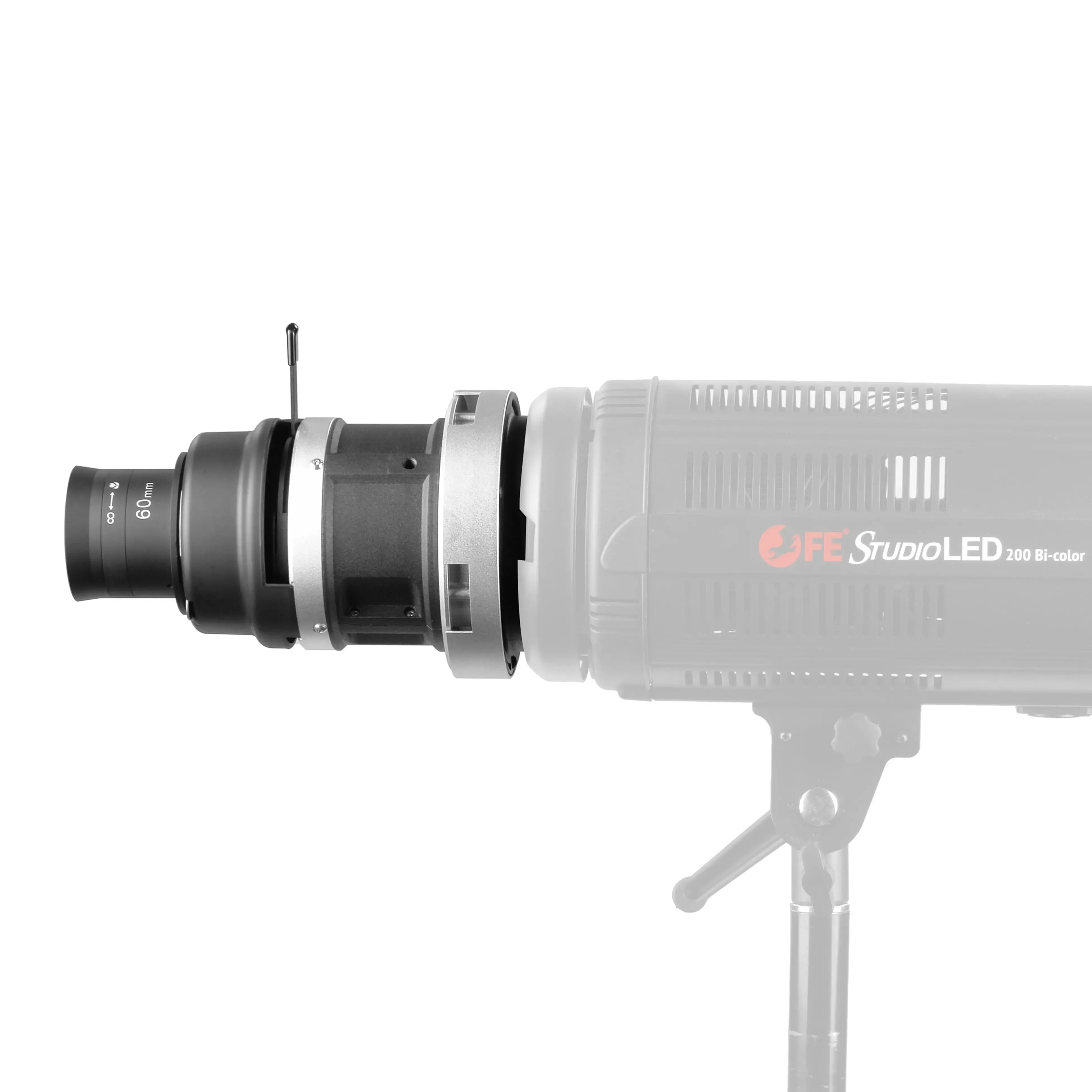 Фокусируемый объектив 60 мм устанавливается на байонет Canon EF и создает круг света с четкими краями без обесцвечивания или эффекта ореола (с данной насадкой можно использовать и другие объективы с байонетом Canon EF). Проекционный объектив с системой фокусировки позволяет регулировать степень размытия границ формируемого контура.