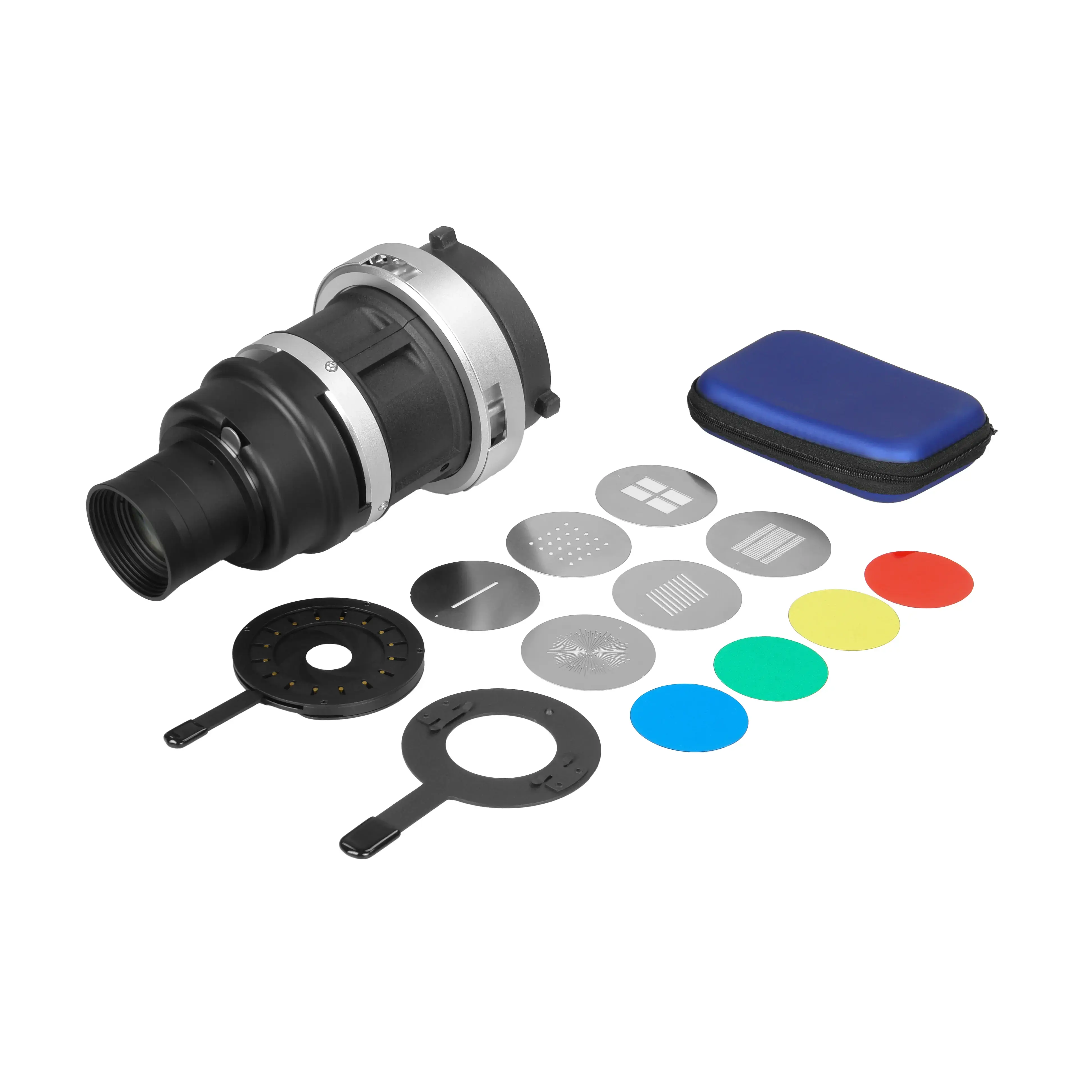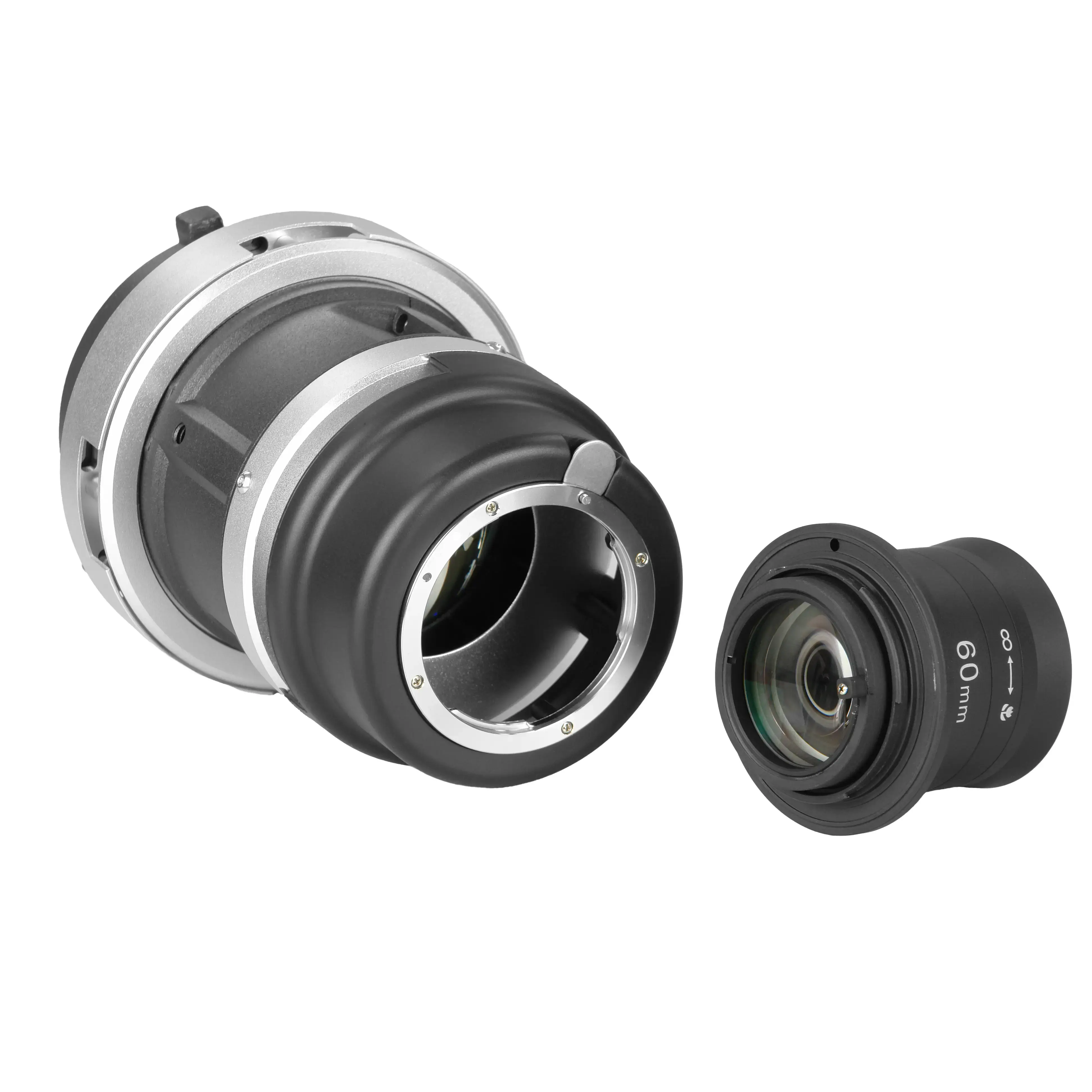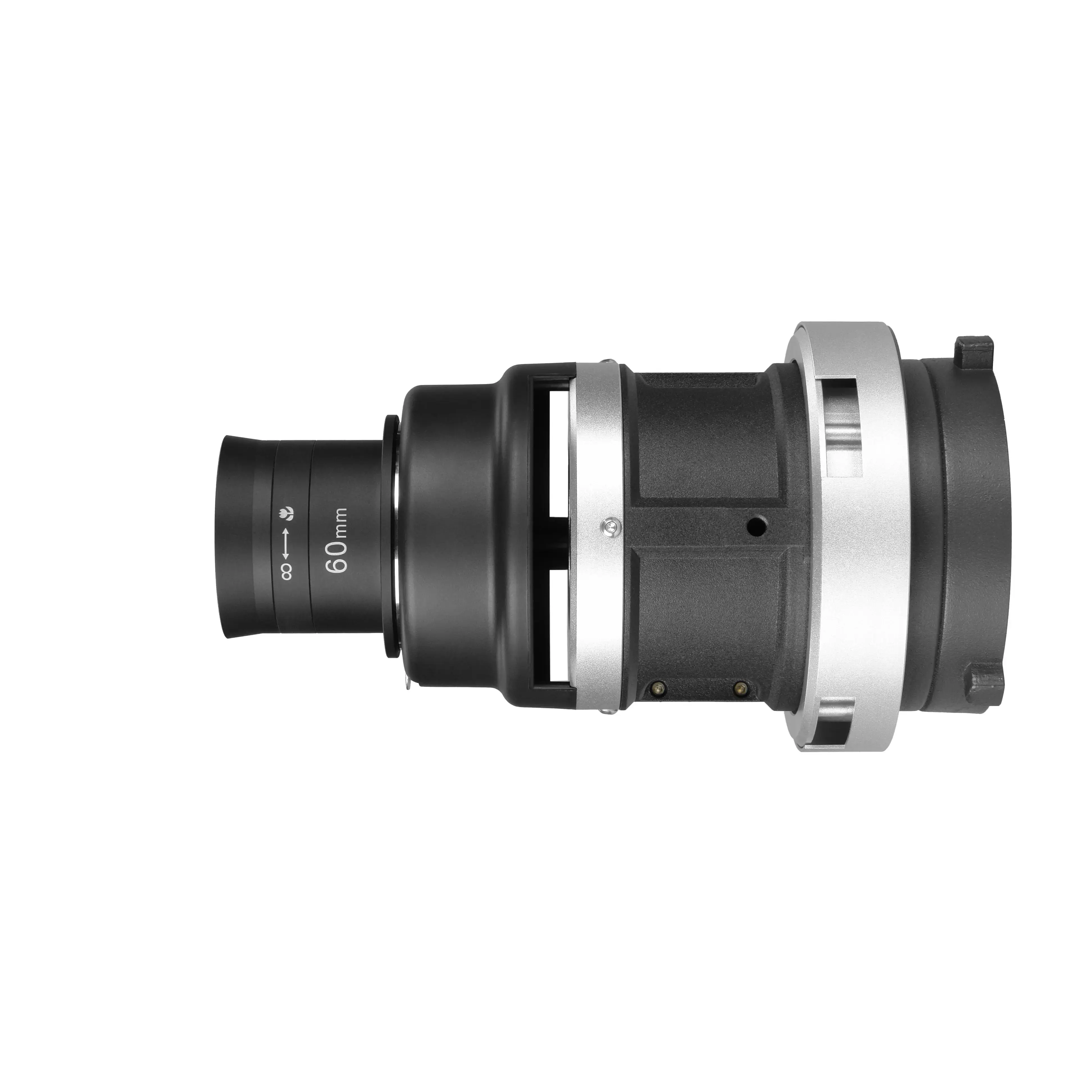 Фокусируемый объектив 60 мм устанавливается на байонет Canon EF и создает круг света с четкими краями без обесцвечивания или эффекта ореола (с данной насадкой можно использовать и другие объективы с байонетом Canon EF). Проекционный объектив с системой фокусировки позволяет регулировать степень размытия границ формируемого контура.