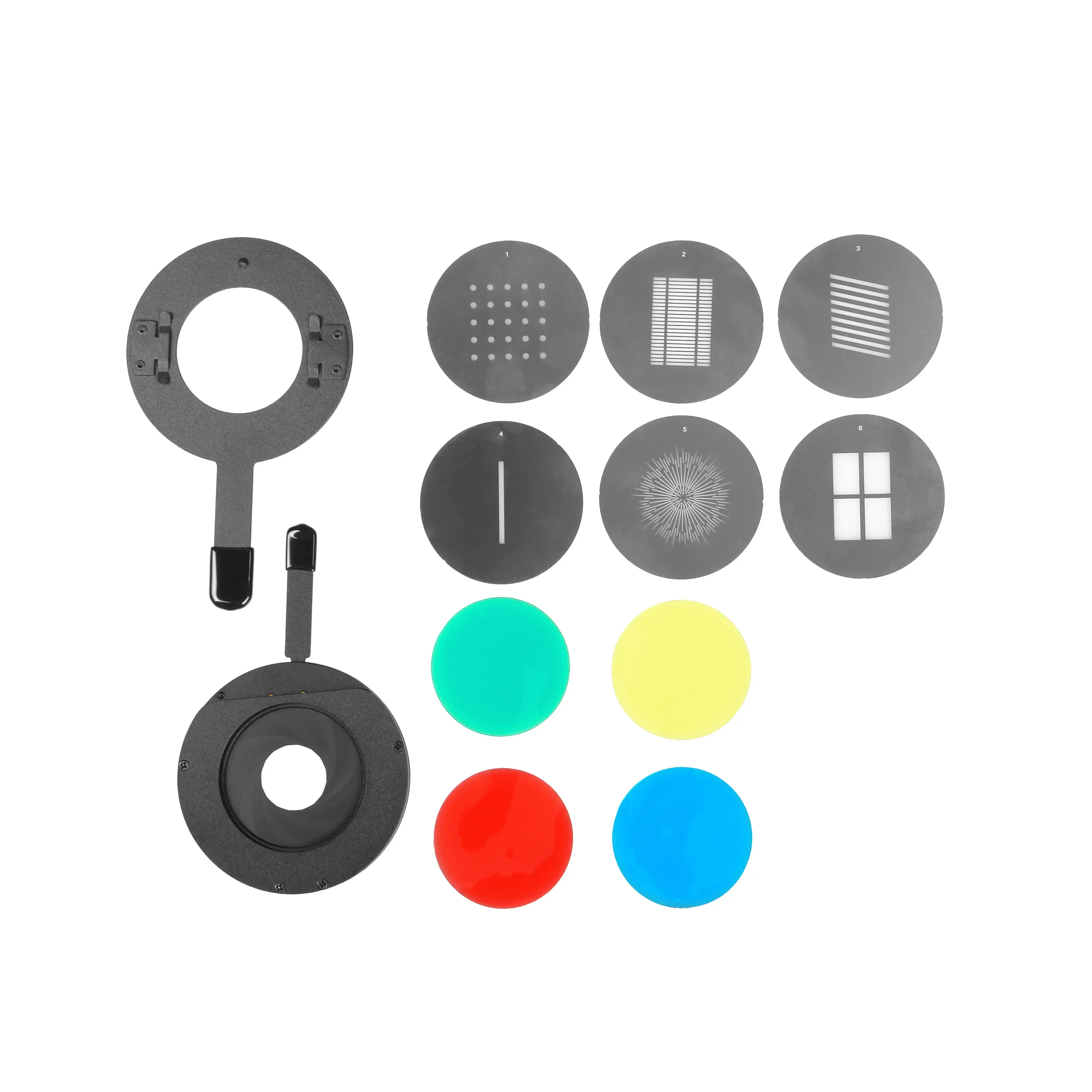 Для создания креативного освещения в комплекте предусмотрены маски Гобо и цветные фильтры, упакованные в удобный кейс. Возможно применение цветных фильтров в комбинации с масками Гобо при помощи ирисовой диафрагмы.