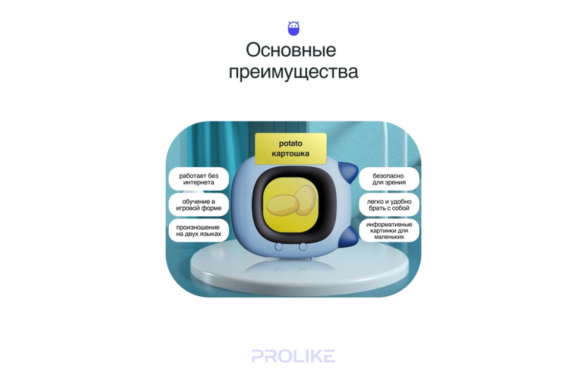 Обучающая игрушка Prolike с карточками - идеальный подарок для детей и их родителей! Развивающий планшет с набором карточек на двух языках: русский и английский, поможет в приобретении первых знаний, расширить словарный запас ребенка, развить мелкую моторику, запустить речь и выучить новые слова сразу на двух языках. В набор входит 56 двусторонних карточек, которые содержат 112 слов по 12 темам. Каждая карточка озвучивается на русском и английском, тем самым решая вопросы перевода, произношения и ударений. Карточки для изучения английского содержат информативные картинки для самых маленьких, а также воспроизводят звуки транспорта и животных. Детский планшет удобно держать, он не требует подключения к интернету, безопасен для зрения, его легко брать с собой в гости и поездки. Такая игрушка для изучения языка разнообразит ваши занятия, легко впишется в игровую форму обучения, а также подойдет для группового или индивидуального обучения.