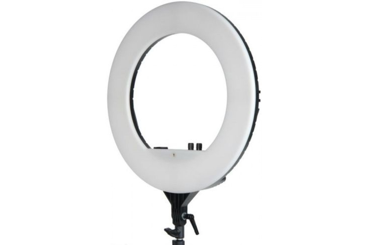 Легкий и компактный осветитель с источником света в виде кольцевой панели со светодиодами, с регулируемой мощностью светового потока и цветовой температурой.