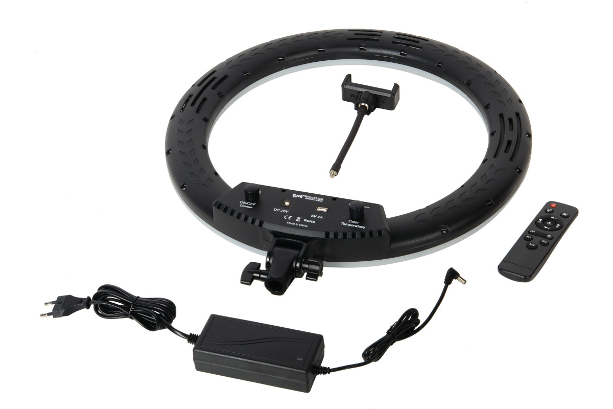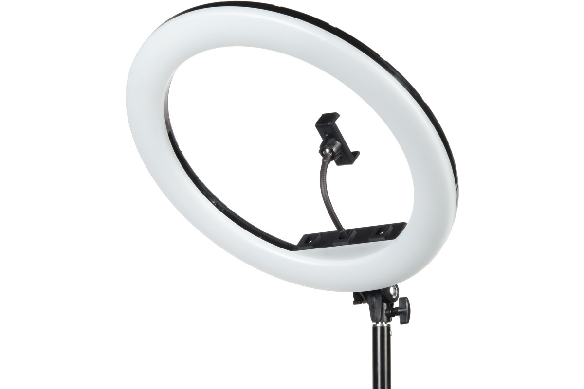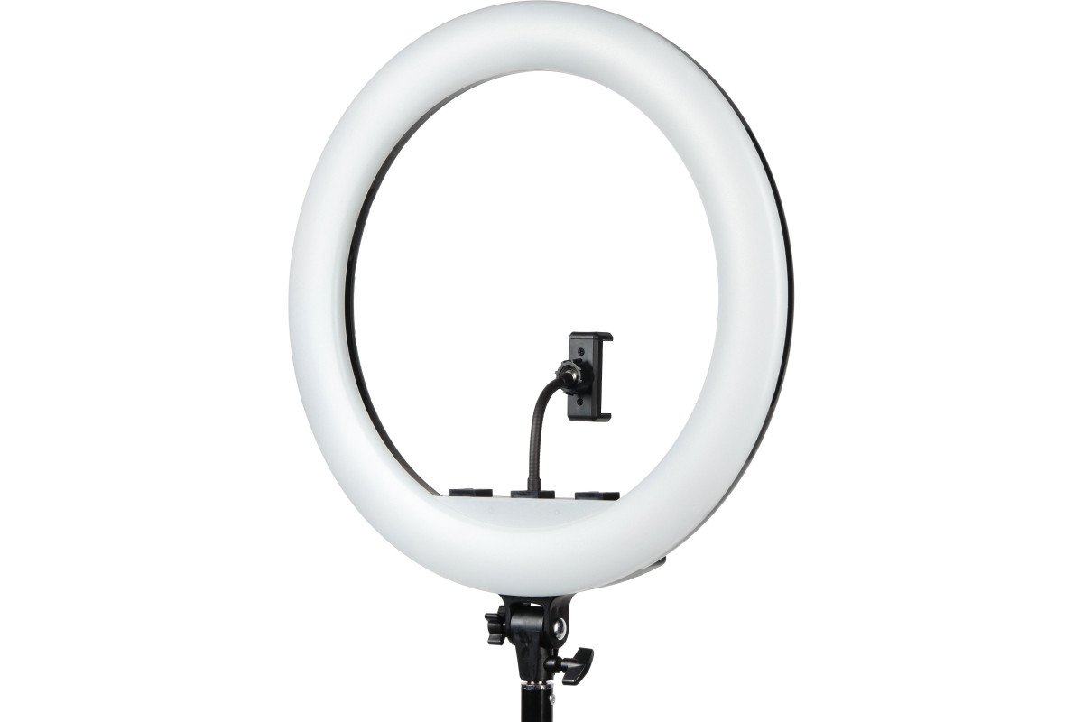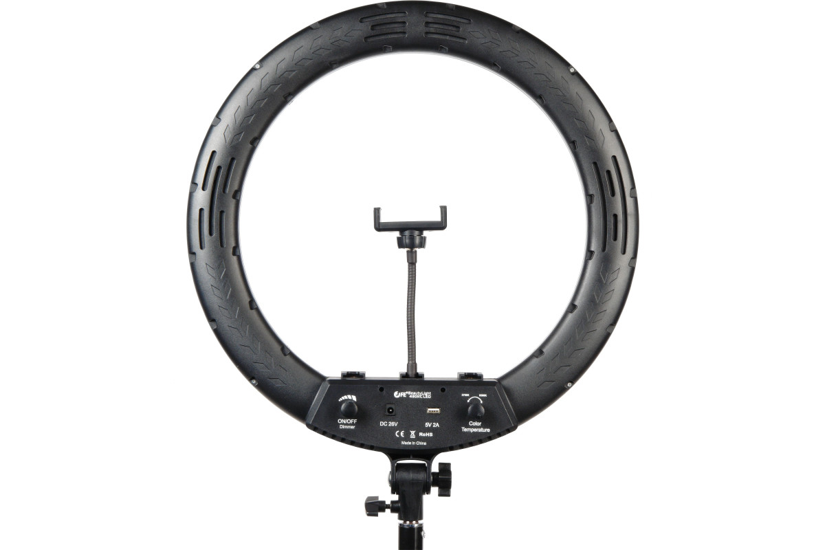 Falcon Eyes BeautyLight 480RC LED – компактный кольцевой осветитель со световой панелью внешним диаметром 46 см, на которой расположено 240 светодиодов теплого и холодного света, с плавно регулируемой мощностью светового потока от 10 до 100% (50 Вт). Пользователь может одним диммером выставить нужную цветовую температуру, а другим уже регулировать мощность светового потока. Держатель для смартфона и пульт дистанционного управления входят в комплект.