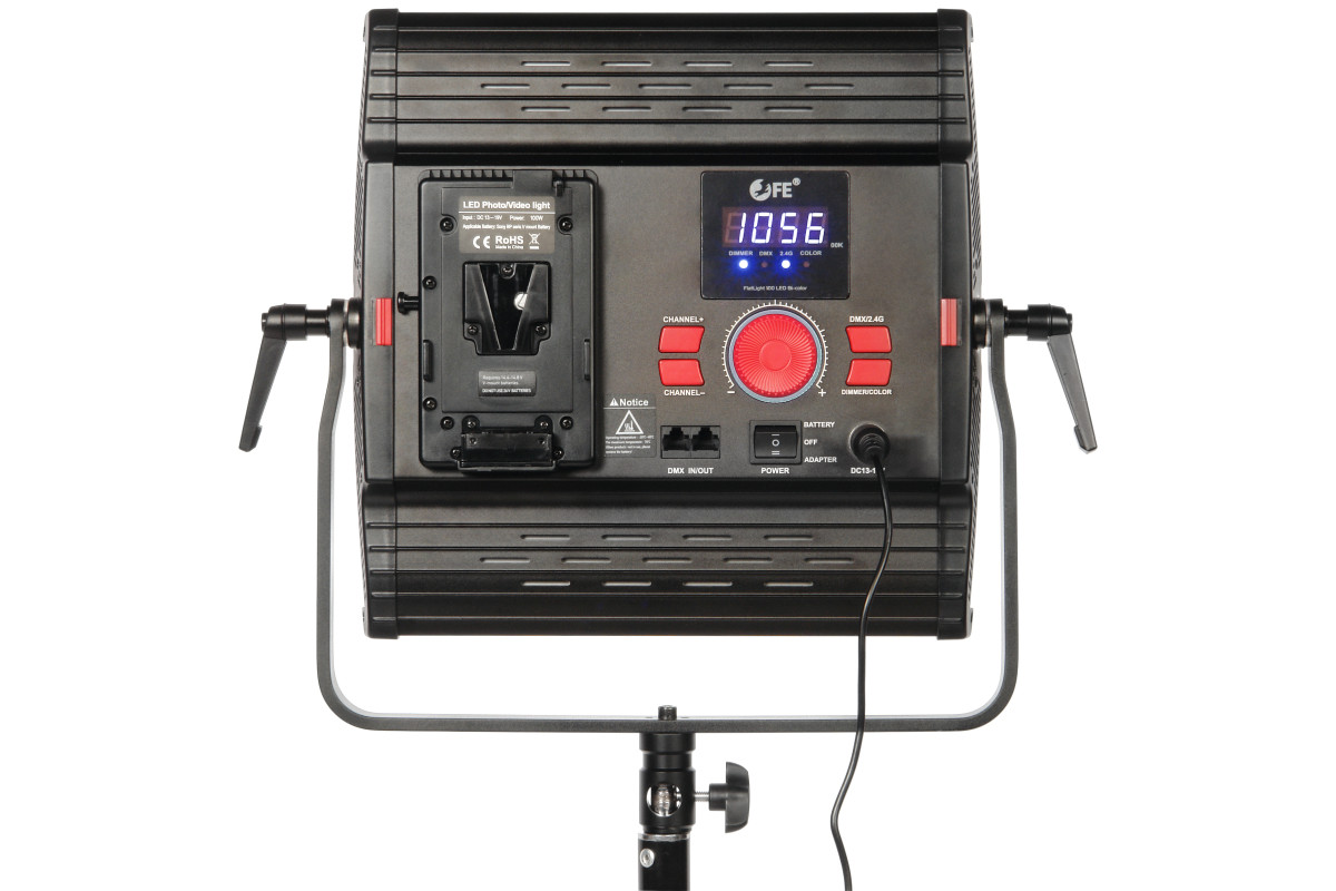 Режимы управления могут задаваться на панели управления, расположенной с тыльной стороны осветителя. Яркий ЖК-дисплеей 5х2 см с четырехразрядной индикацией, отображает заданные параметры осветителя. Ниже расположены колесо-диммер, 4 функциональные кнопки и кнопка питания. Несмотря на небольшое количество, кнопки полностью управляют процессом – выбором мощности, цветовой температуры, переключением режимов DMX и радиоканала, назначением каналов, переключением питания от сети или аккумуляторной батареи.
